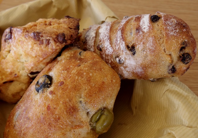 写真手前のオリーブトマトは、私の大好きなパンの1つ。