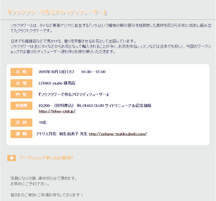 練馬店ではソラフラワーでつくるアロマディフューザーのワークショップを開催致します。