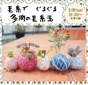 毛糸でぐるぐる◎多肉の毛糸玉つくり♪ 土をこねるところからつくりはじめます。 大小2個の多肉の毛糸玉つくり✿ 季節問わず多肉植物をかわいいインテリアとして育てられます! ♦開催日:3/8(火)10:00~12:00 ...