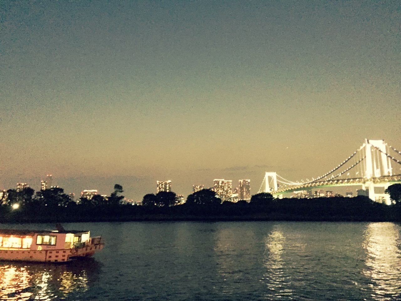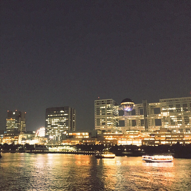 海の上から見るお台場は水面にも明かりが映ってすごくキラキラしていてきれいですね。