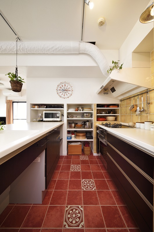 キッチンの床は赤のタイル、壁には黄色いタイルが貼られていてもとても可愛らしい雰囲気になっています♪