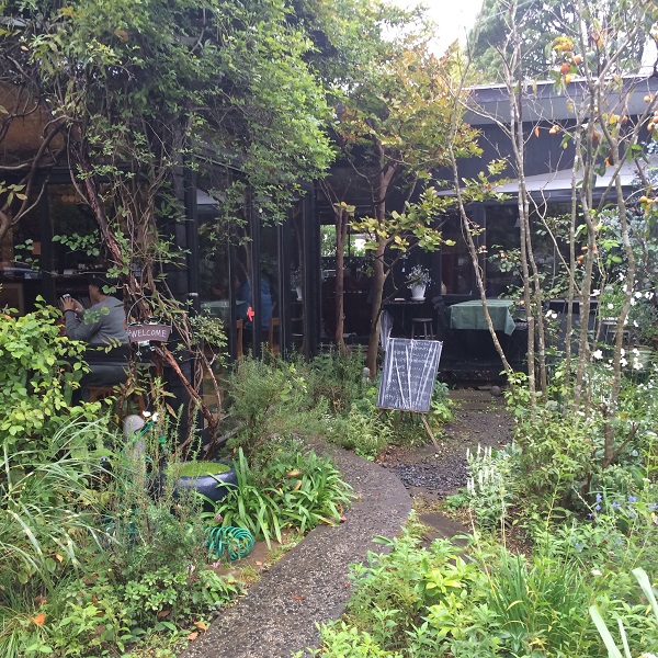 お庭には草木がたーくさん!カエルの置物が所狭しと置かれています!