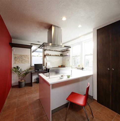 白いキッチンに映える赤い壁が、気分も明るくさせてくれますね。