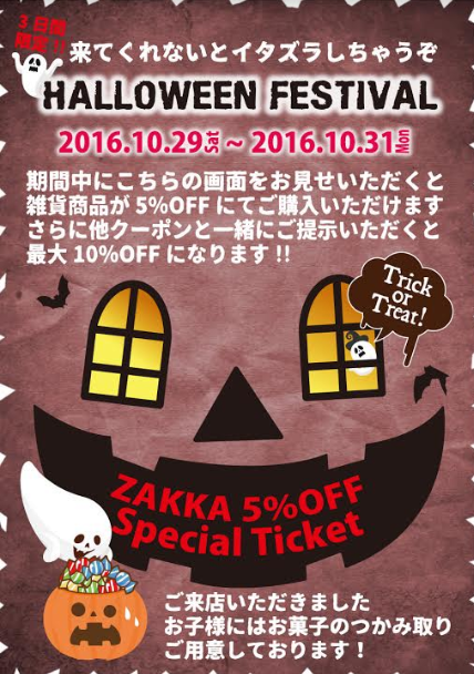 期間中にはLINEで配信しているハロウィン限定雑貨5%OFFクーポンや通常のLINE5%OFFクーポンもダブルで使用可能!!