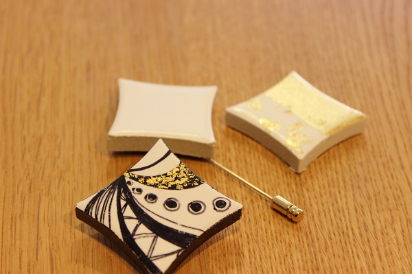 タイルに思い思いのデザインをして金箔をはったりして、オリジナルのブローチを制作。