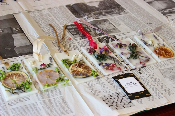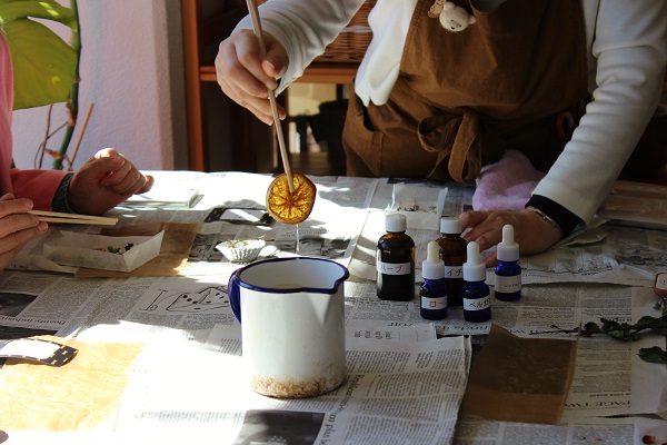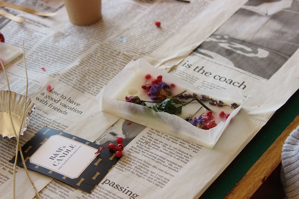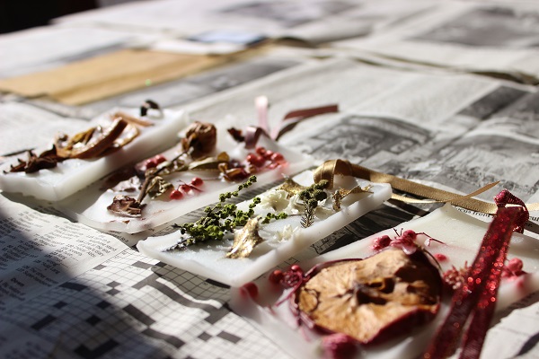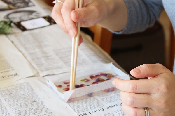 レイアウトが出来たら溶かした蜜蝋を型に流し込み、ドライフラワーなどを一度蜜蝋にくぐらせます。