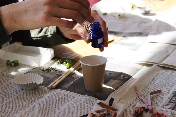 そして流し込む蜜蝋にお好きなアロマオイルをたらします。