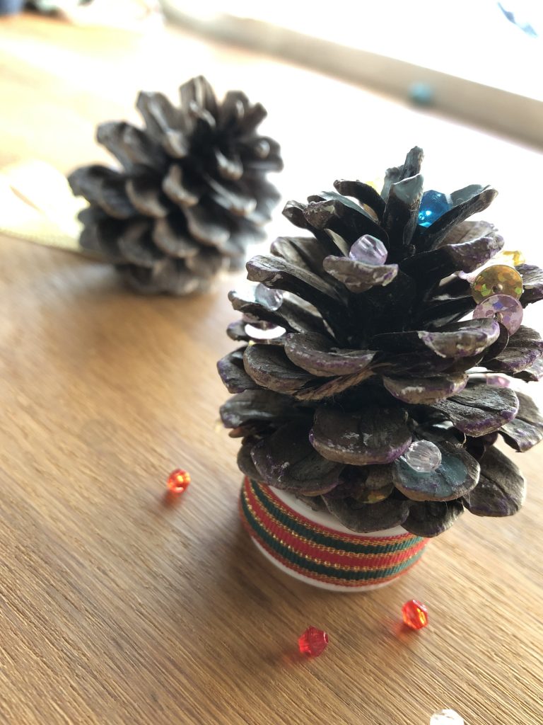 先日、公園で拾った松ぼっくりで、子供と一緒にツリーとオーナメントを作りました。