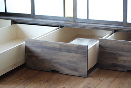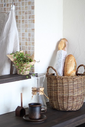 オープンキッチンのリビング側はカウンターになっていて、その下には 棚を造作。