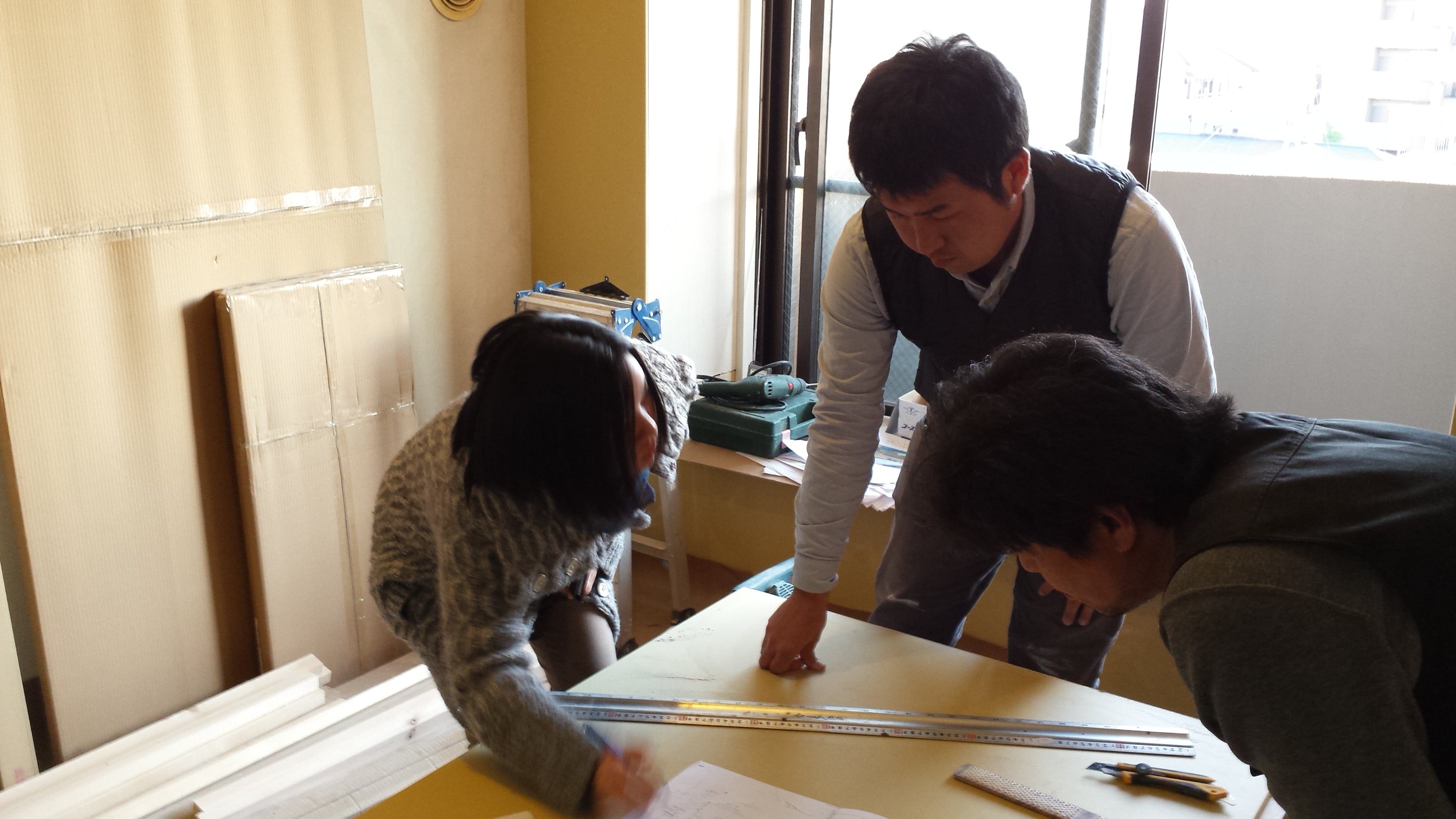 左からデザイナーと現場監督と大工さん・・そんな姿がいい感じです!!