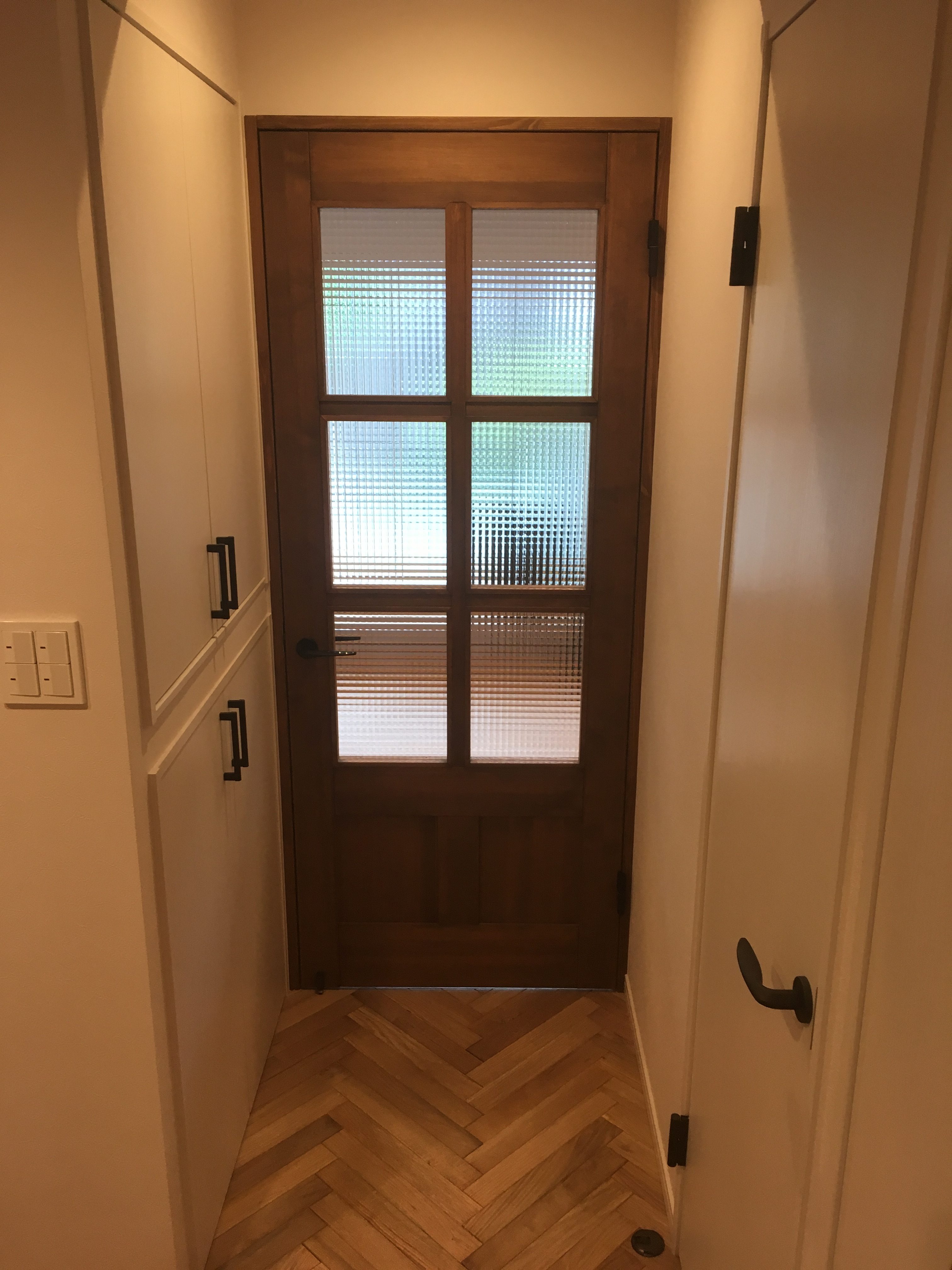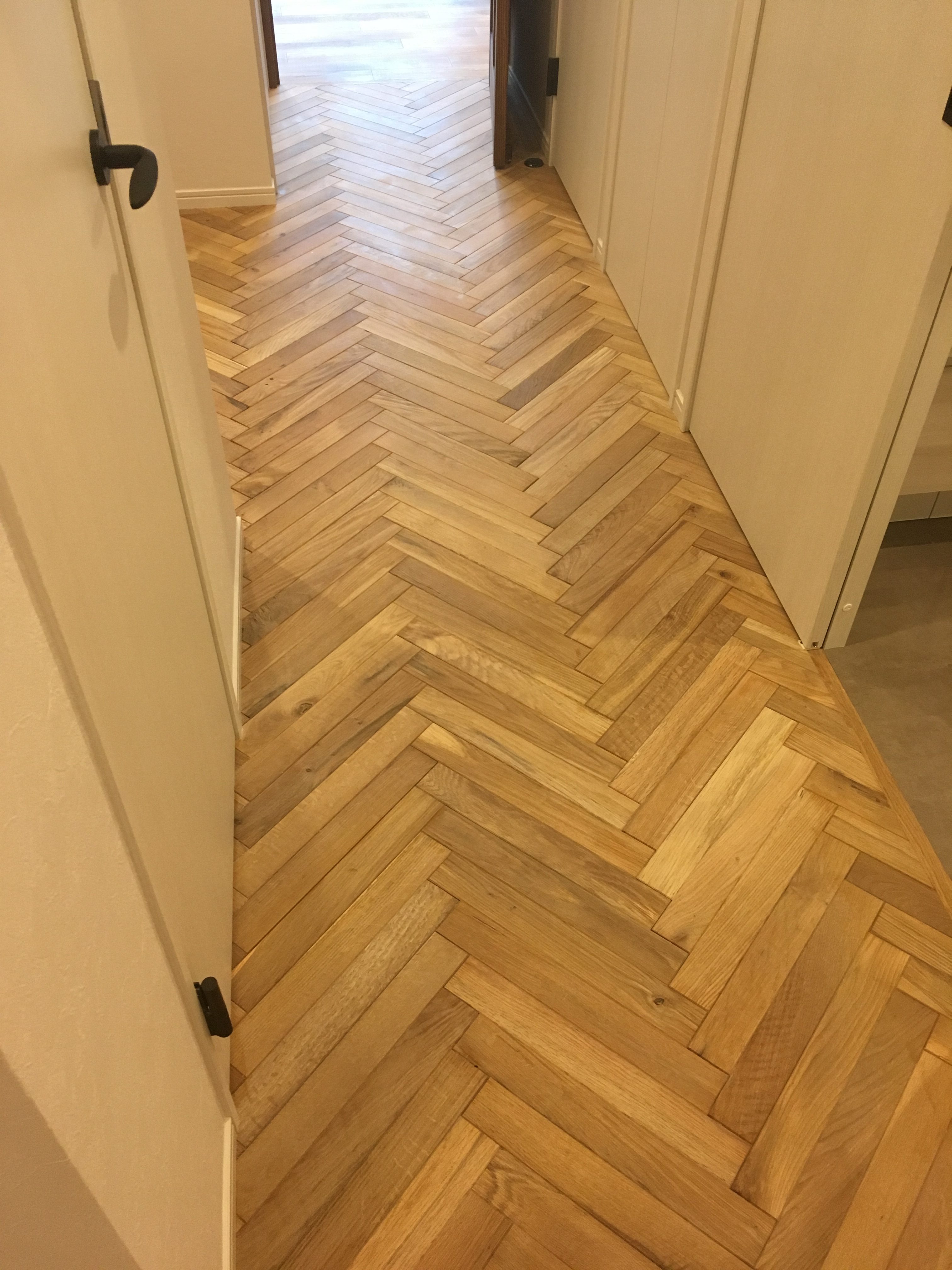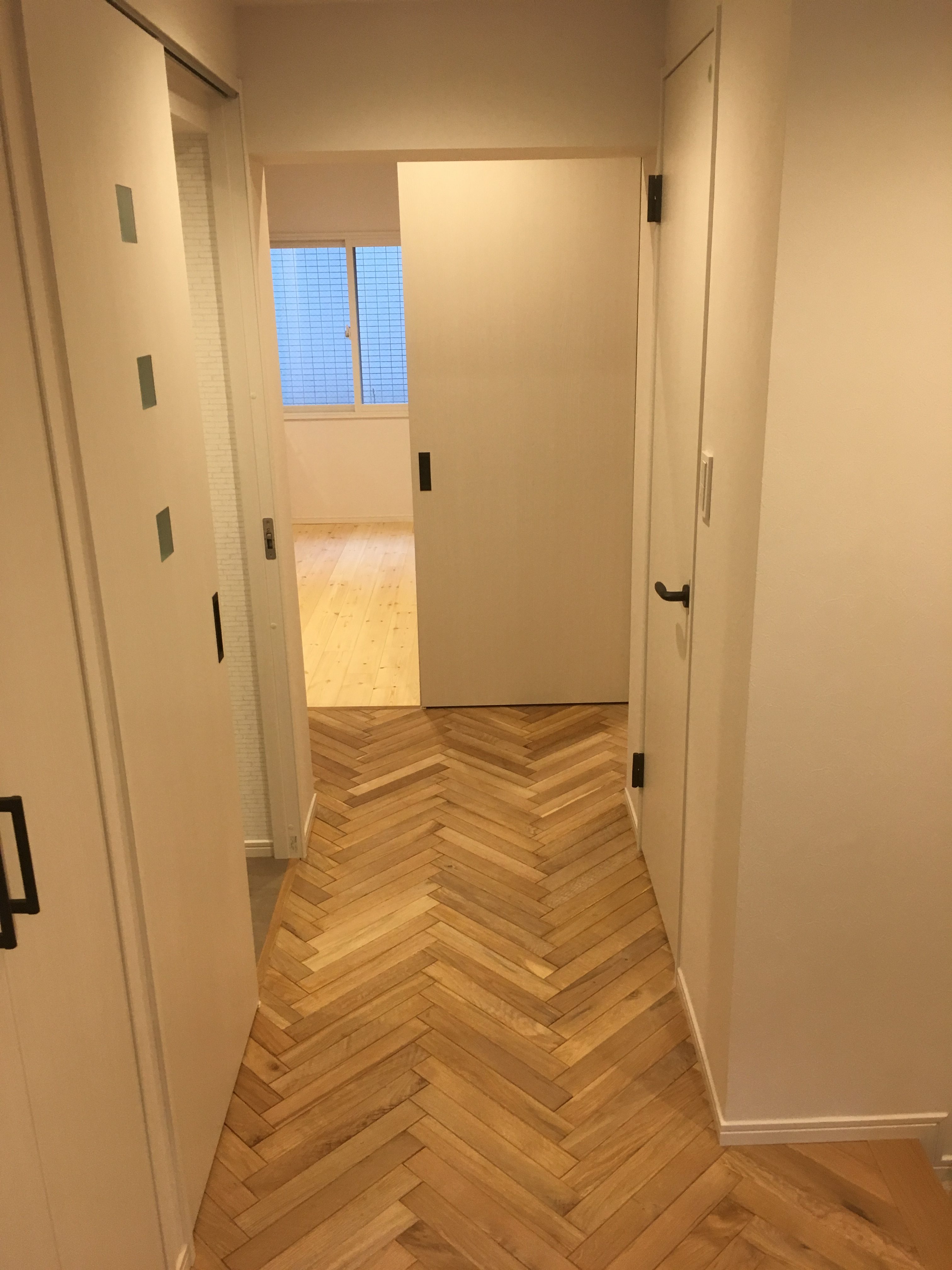 マンション廊下のフローリングをヘリンボーンにて