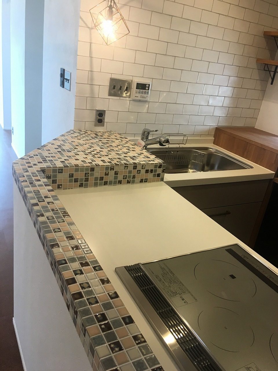 システムキッチン自体はI型のコンロ台とシンクを造作家具にて接続。