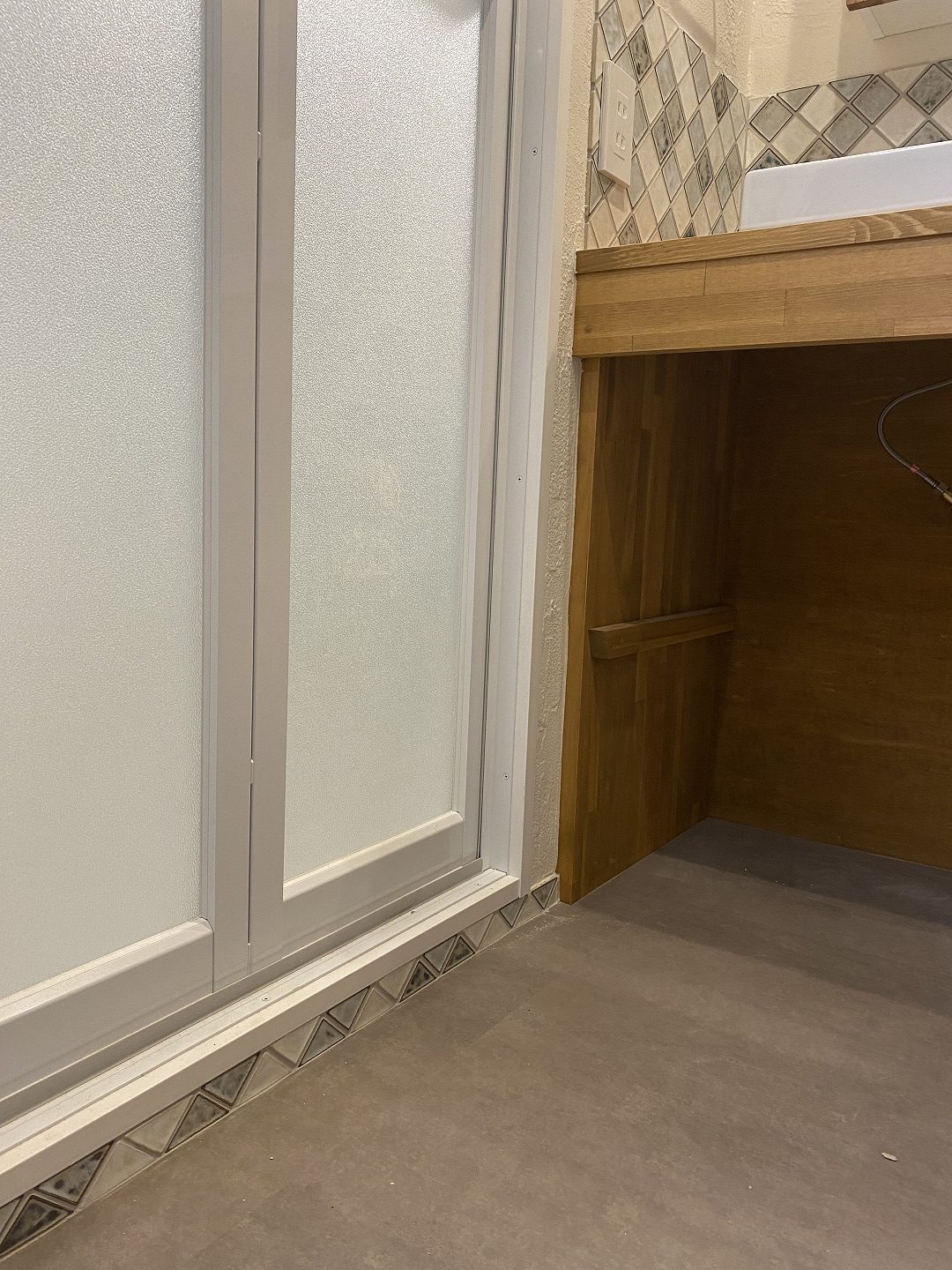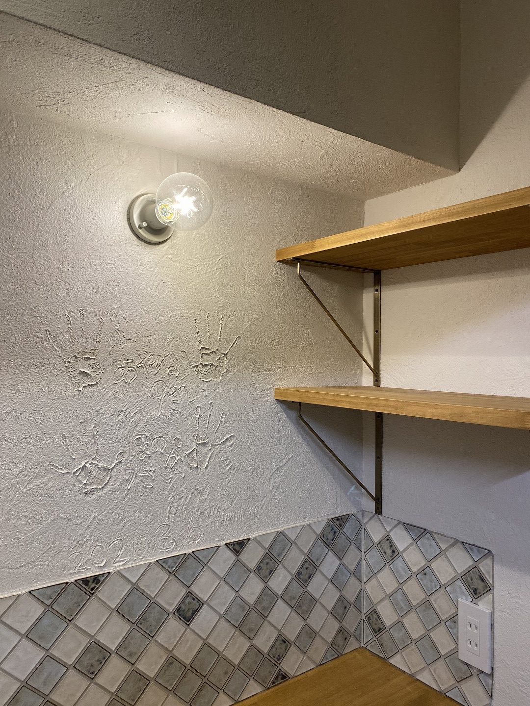 立上り部分と浴室入口の巾木には同じタイルを施して、珪藻土にはお子様の手形を