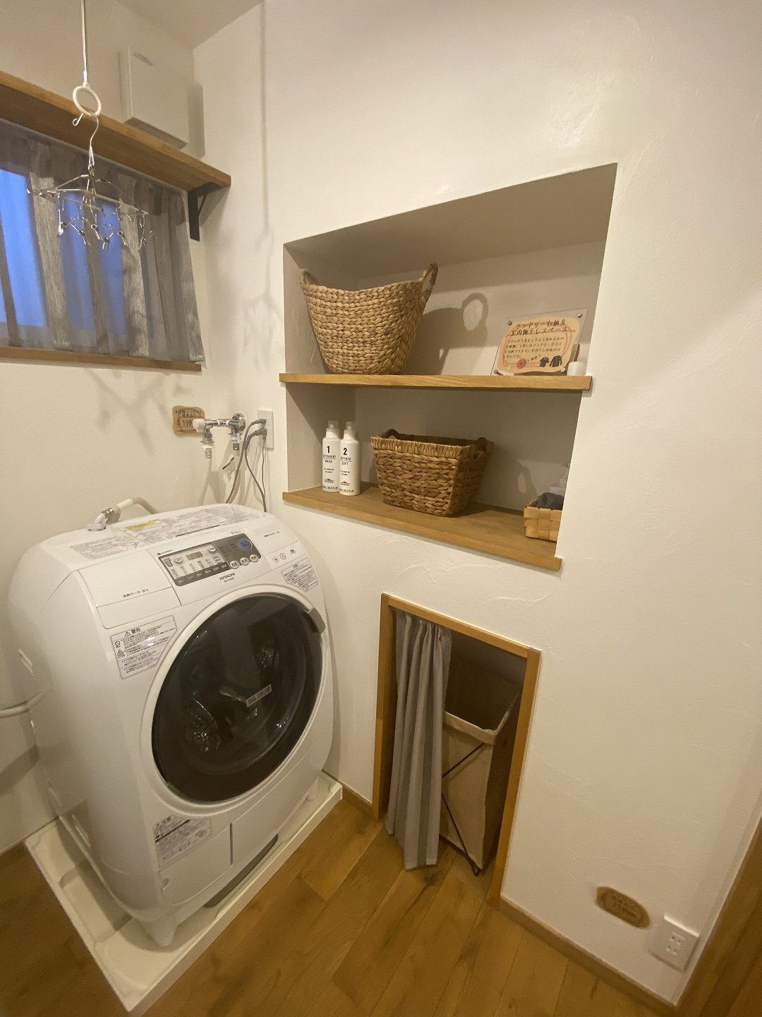 洗濯機横にニッチ収納棚、その下は洗濯物入れかご置き場を作ってあります。