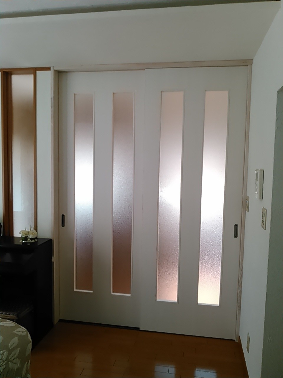 玄関とリビングがオープンな間取りだったため、冬場の冷気及び夏場のエアコン効率を考えて新たに設置した引き違いの造作建具。