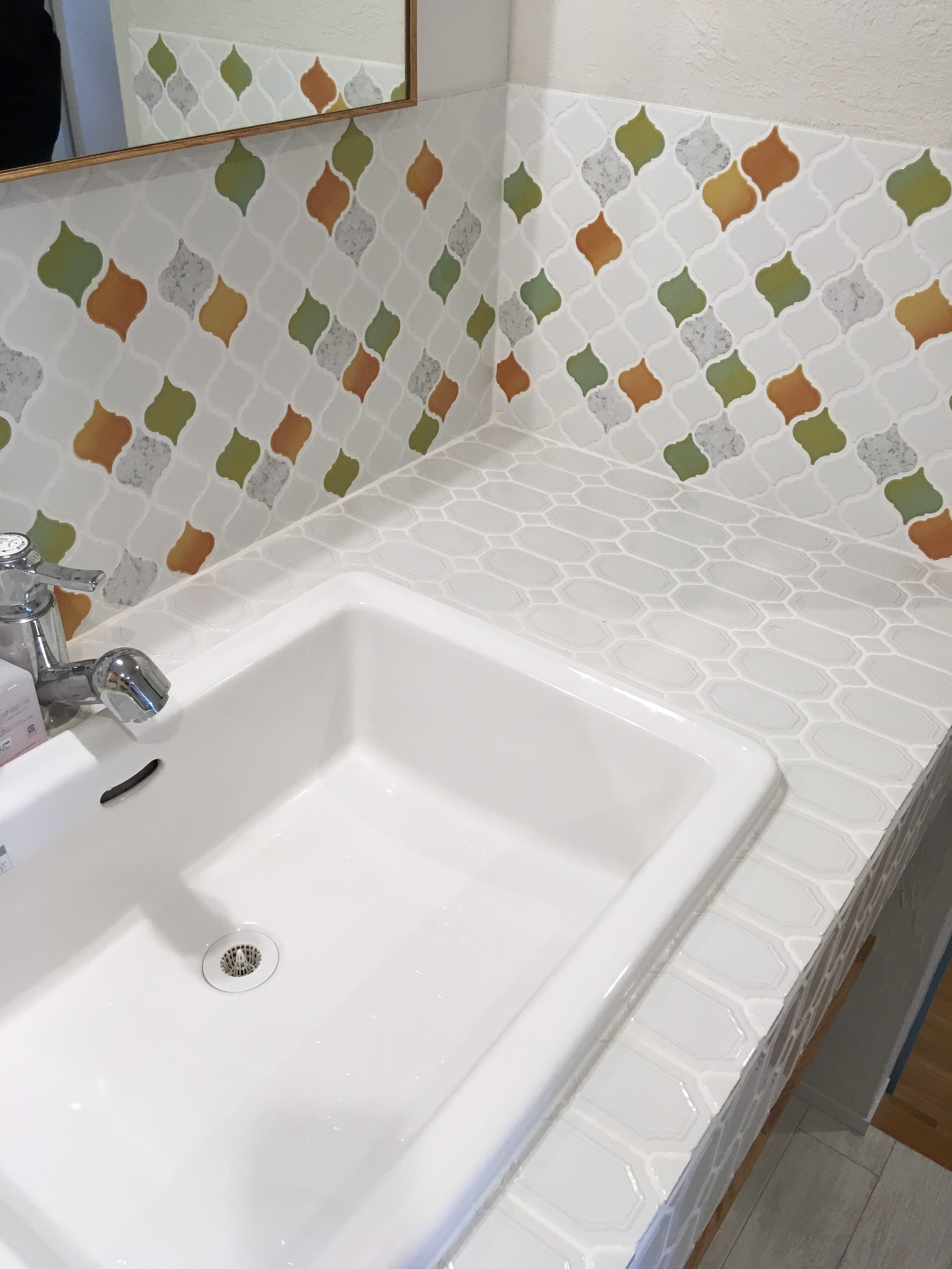 カウンター天板と水跳ねする部分の立上りはタイルを貼りました。