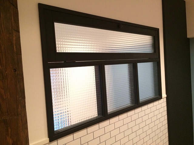 ガラスはチェッカーガラス[ヒシクロスFLK-03]にして下三枚はFIX、上一枚は打ち倒しでプライバシーを守りつつ通風を取りました。