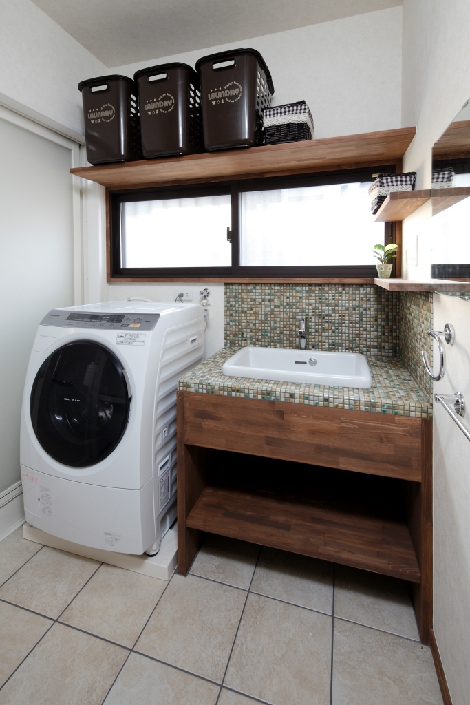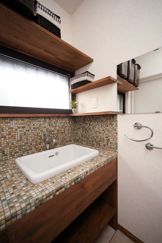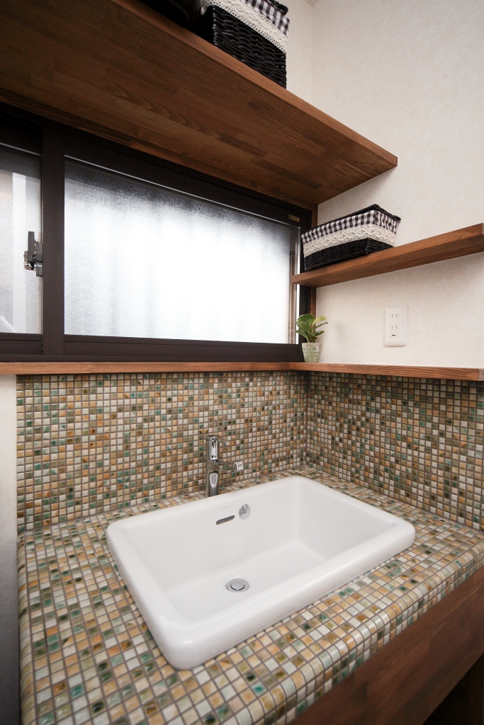 モザイクタイル(名古屋モザイク)をあしらった造作洗面台。