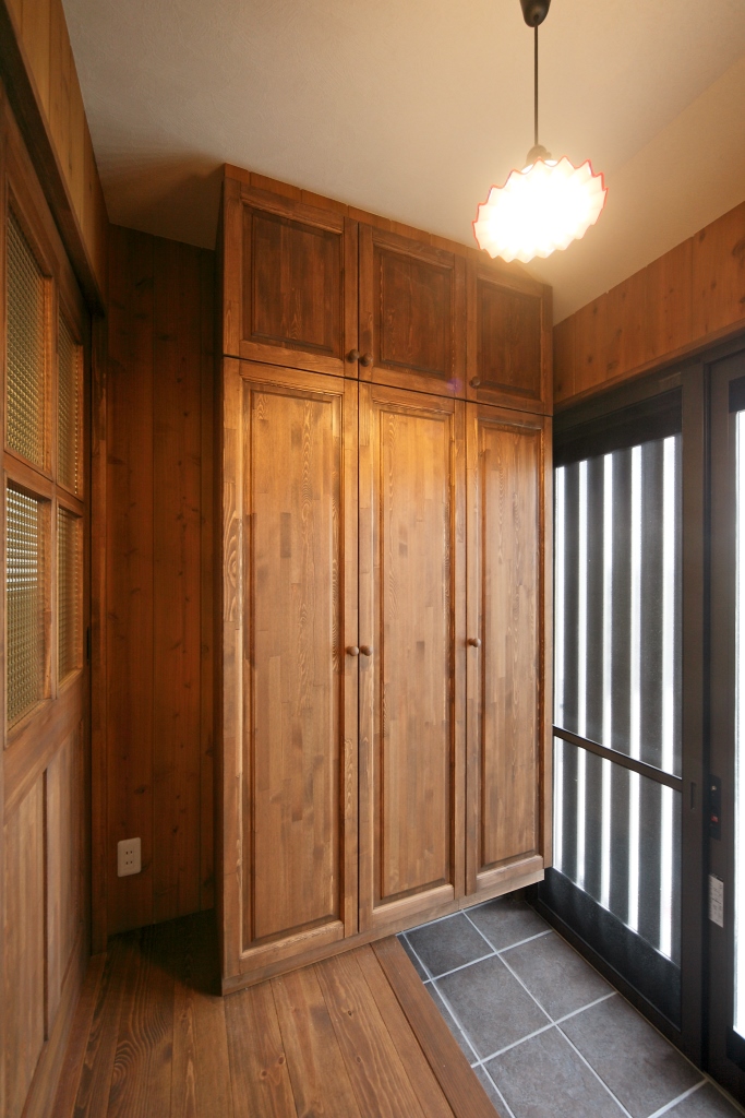 重厚なデザインをご希望でしたので、弊社のオリジナル玄関収納に着色をして仕上げました。。
