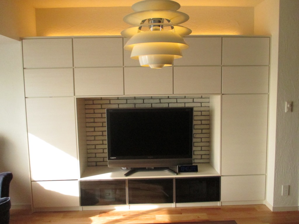 大画面TVの後ろに貼ったブリックタイルとのマッチングが最高ですね☆