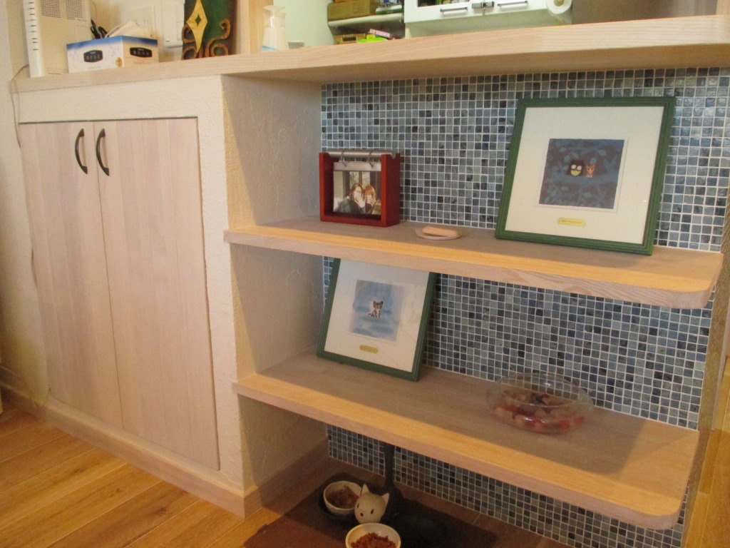 オープン棚の背面には、アクセントになるタイルを貼りました。