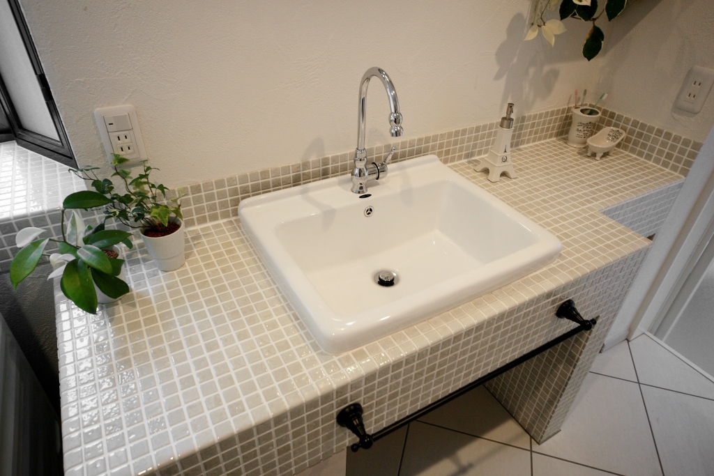 天板にはモザイクタイルを貼っています(名古屋モザイク:プリントモザイク NM-01)