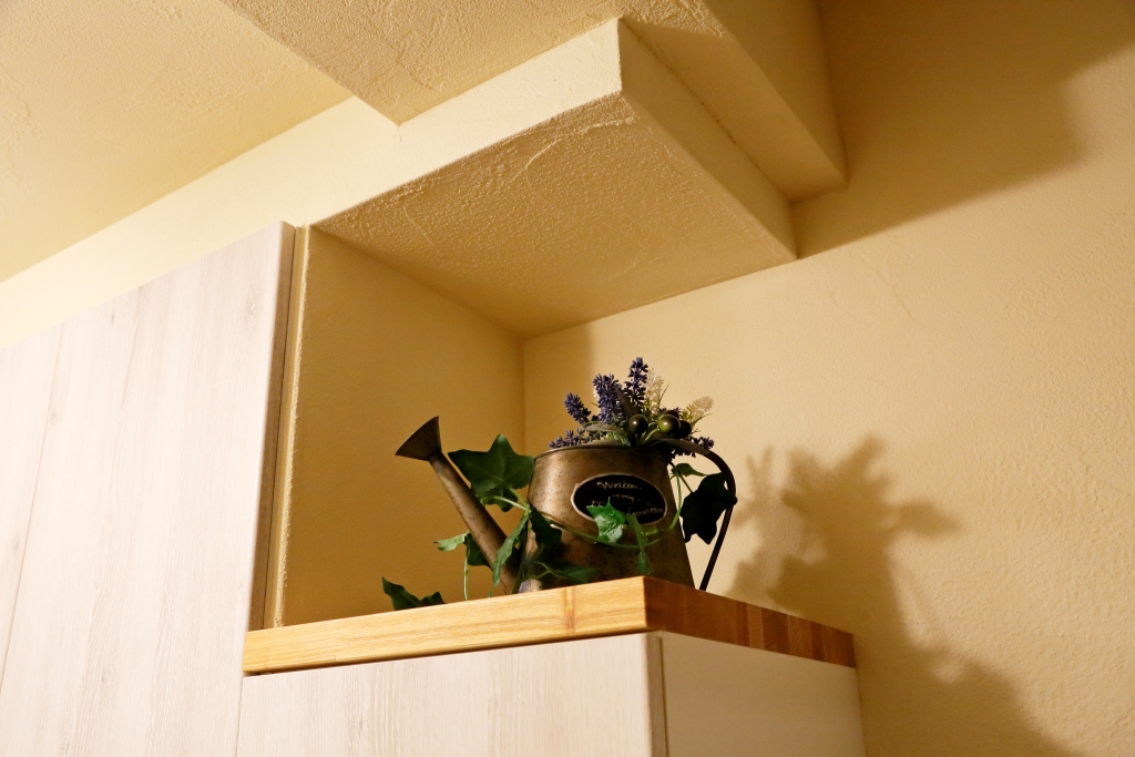 玄関収納の上部にはグリーンを飾るとより壁のとコントラストが楽しめますね。