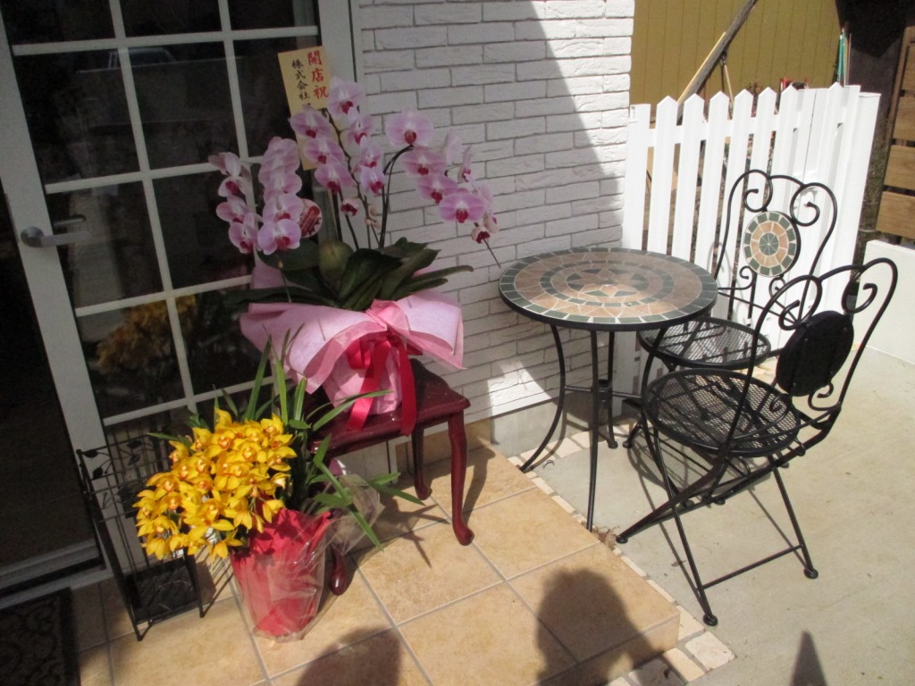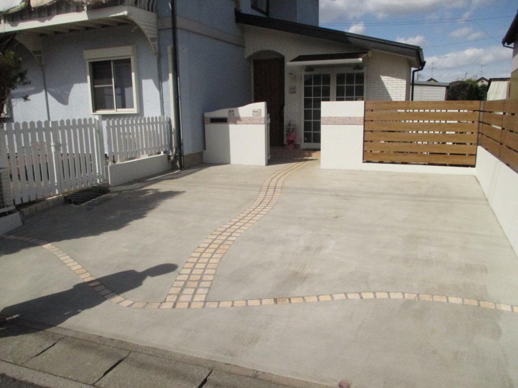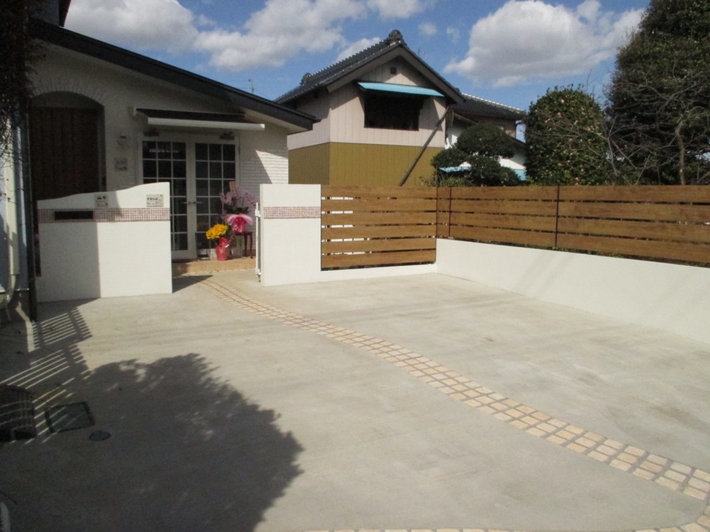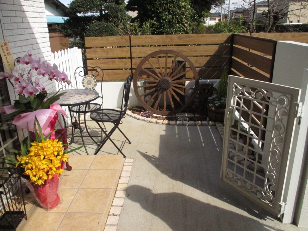 駐車場も素敵に変えたいというとで、既存利用の門扉や、Y様がお持ちの木製の車輪を飾ってイメージを作っています。
