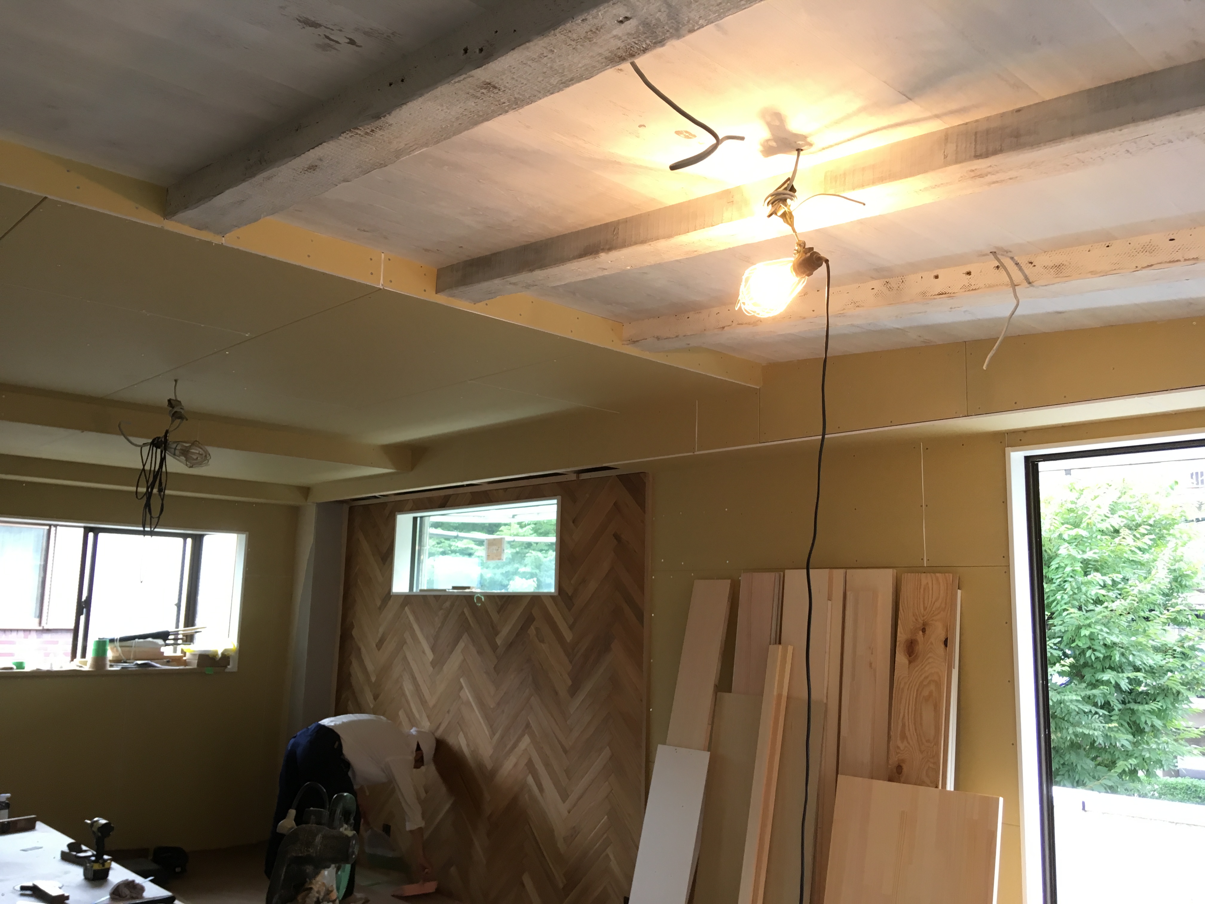 リビングの壁に張ったヘリンボーンも仕上がりました。