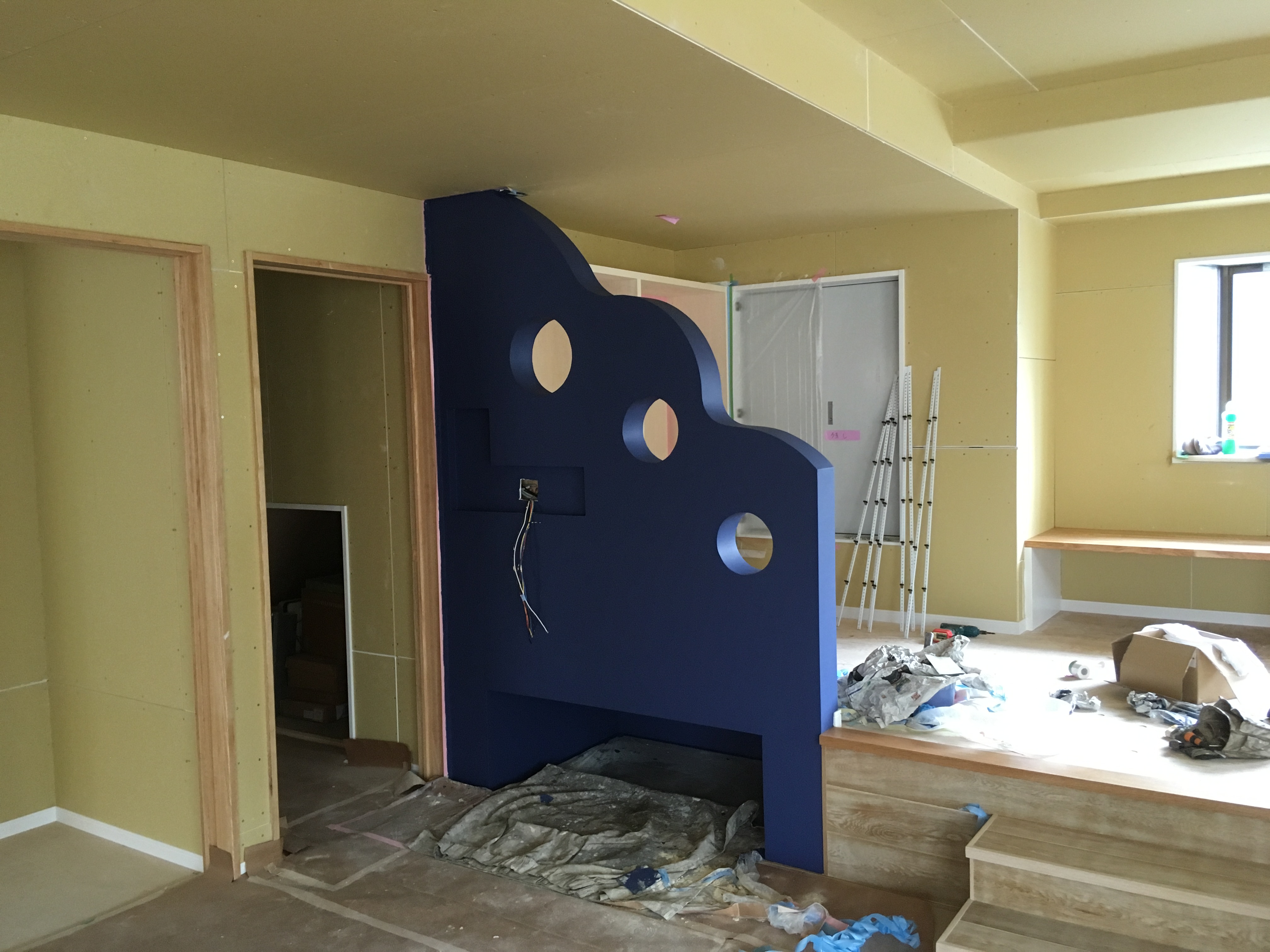 スキップフロアのアクセント壁にブルーの色が入りました。