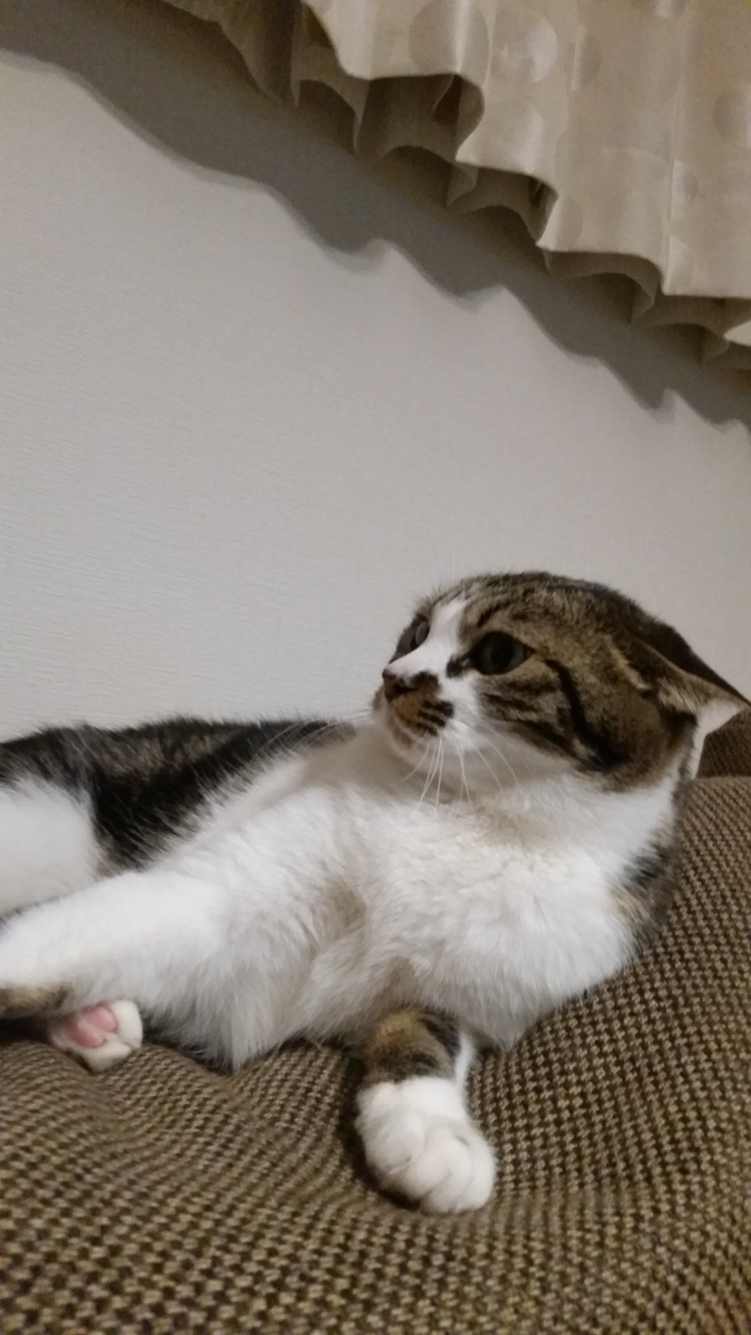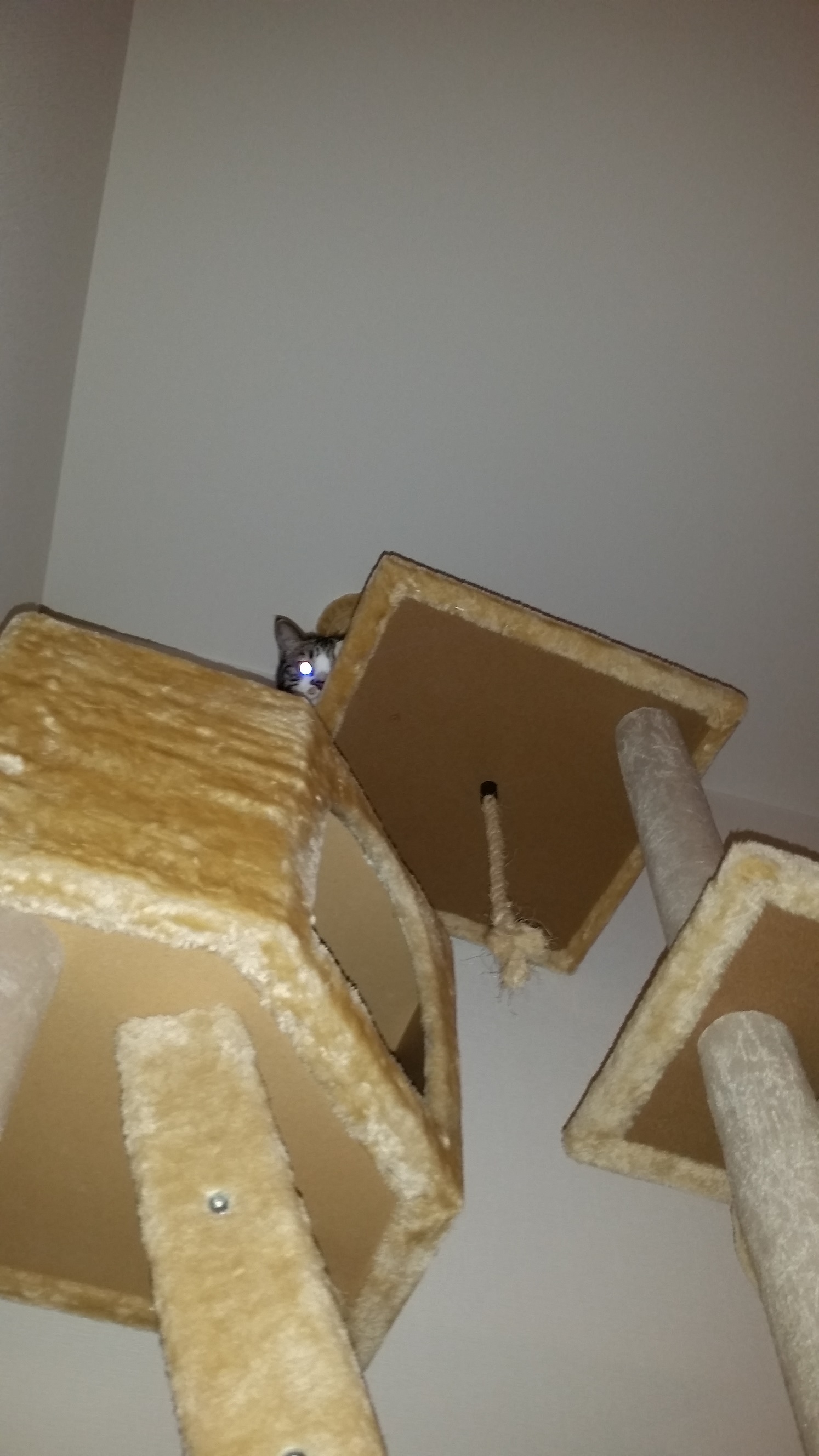 床でストレッチをしてた時にふとキャットタワーを見上げた時の1枚。