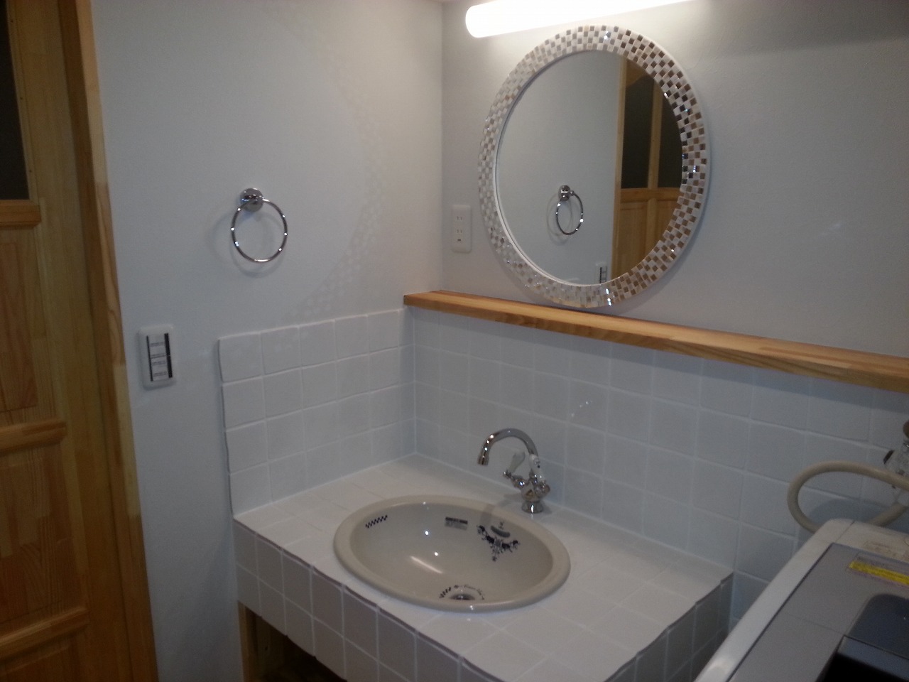 洗面スペースも、配置を変えて前に出し、造作で仕上げることで