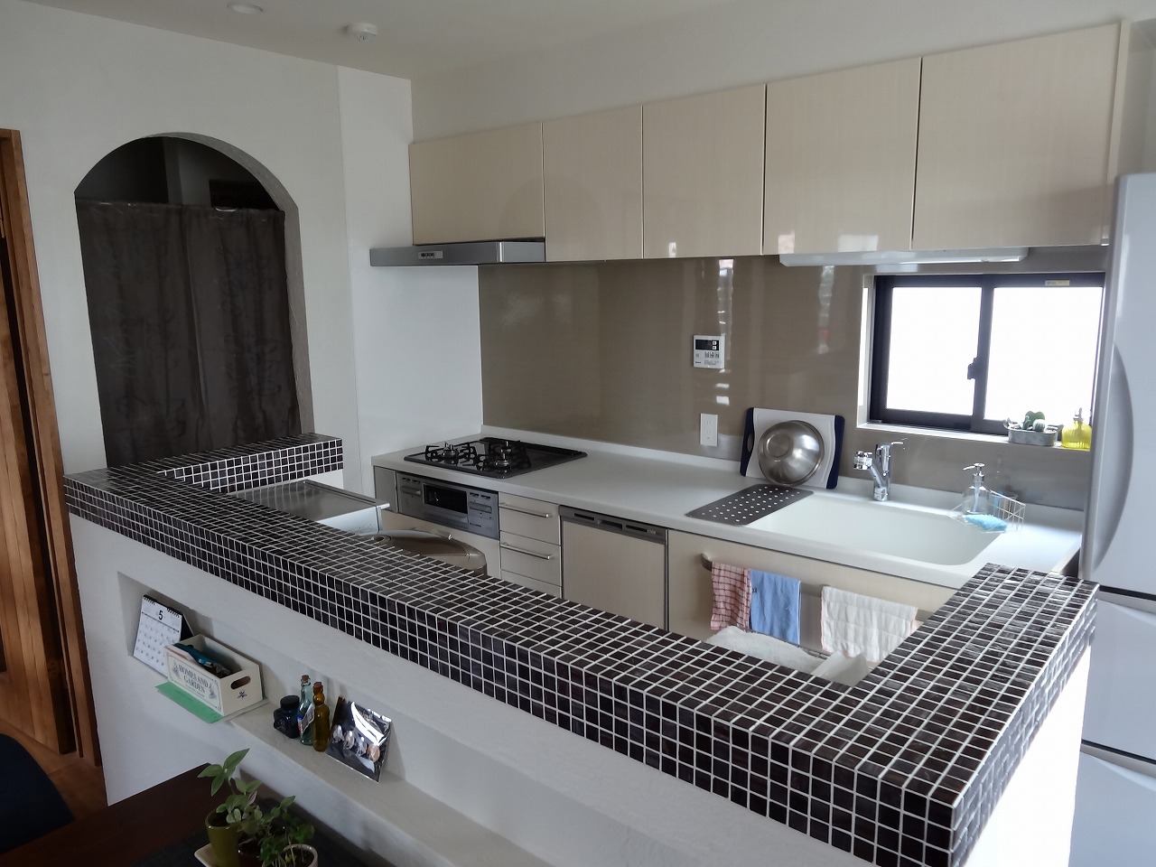 キッチンもタイルを使用して、スタイリッシュな仕上がりなっています。