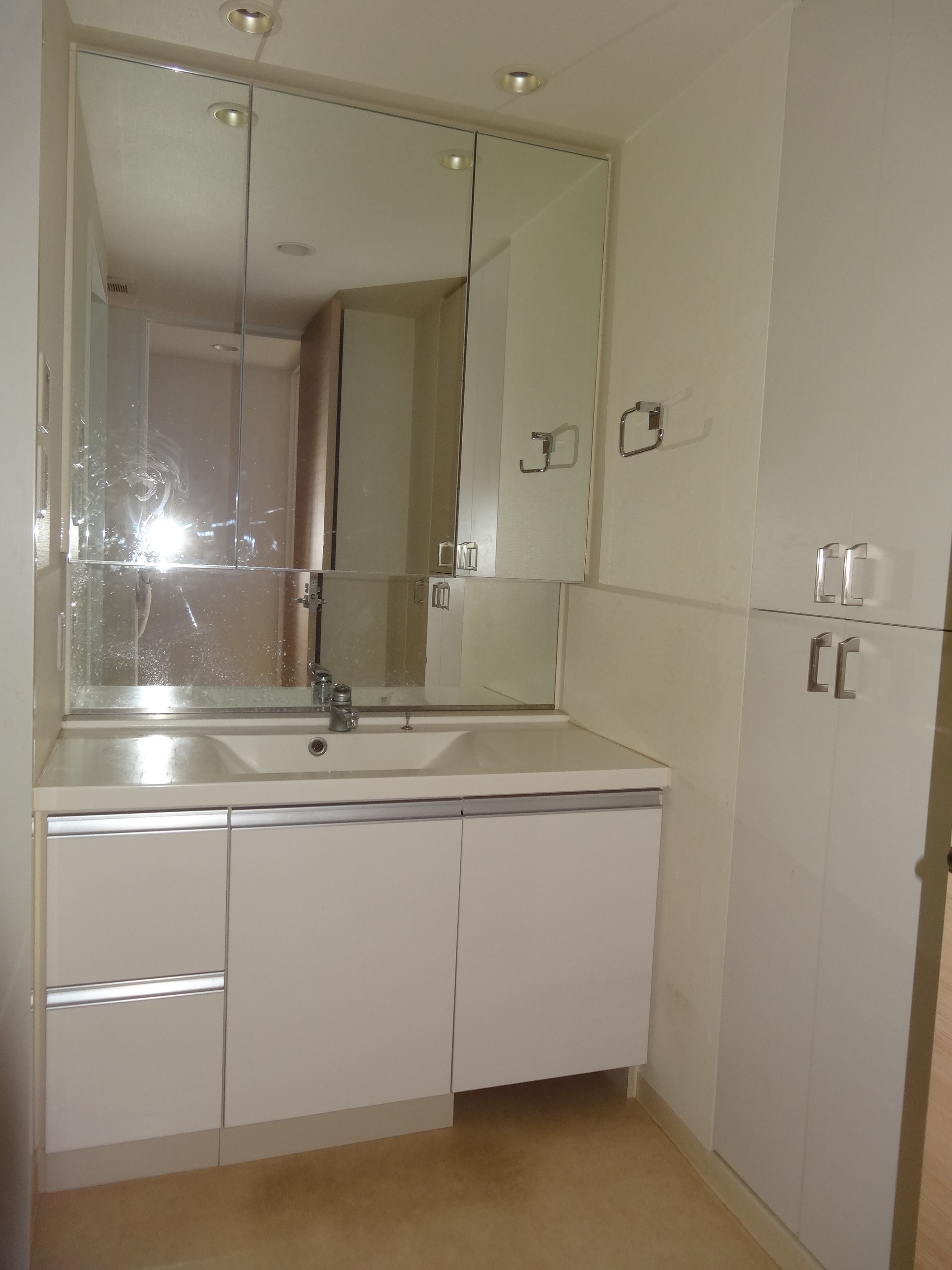 ミラーは一面鏡にしているため、室内をより広く、明るく感じさせてくれますし、収納もしっかり確保しているので