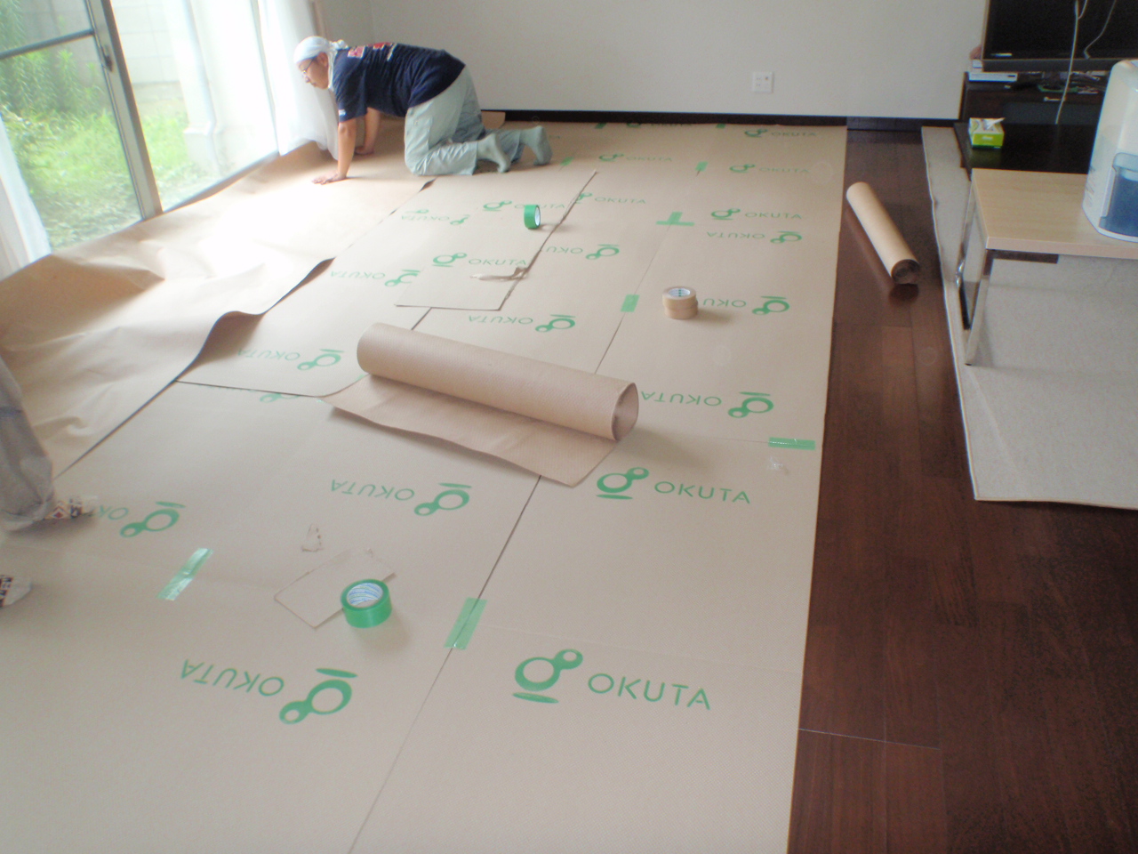 フローリングを傷つけないよう、しっかりと養生をしていきます。