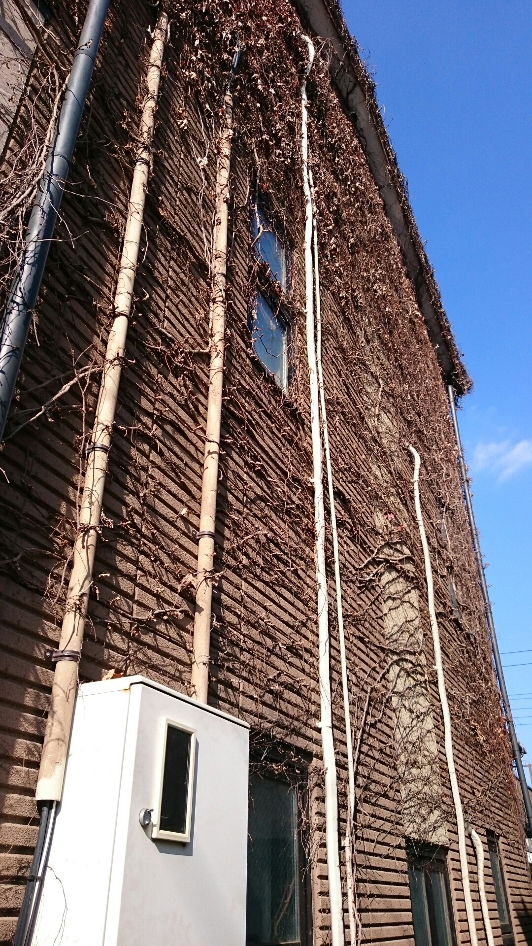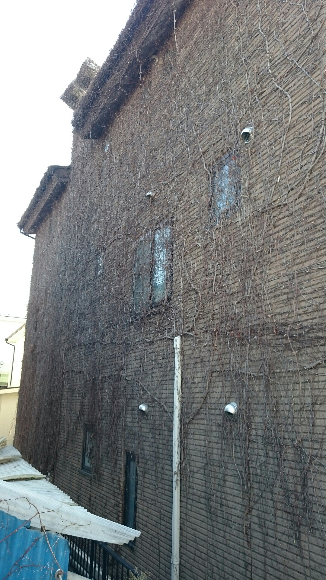 今日からツタ撤去の作業が始まりました。まずは根元部分を撤去し、足場を架けて上部のツタを取り除きます。
