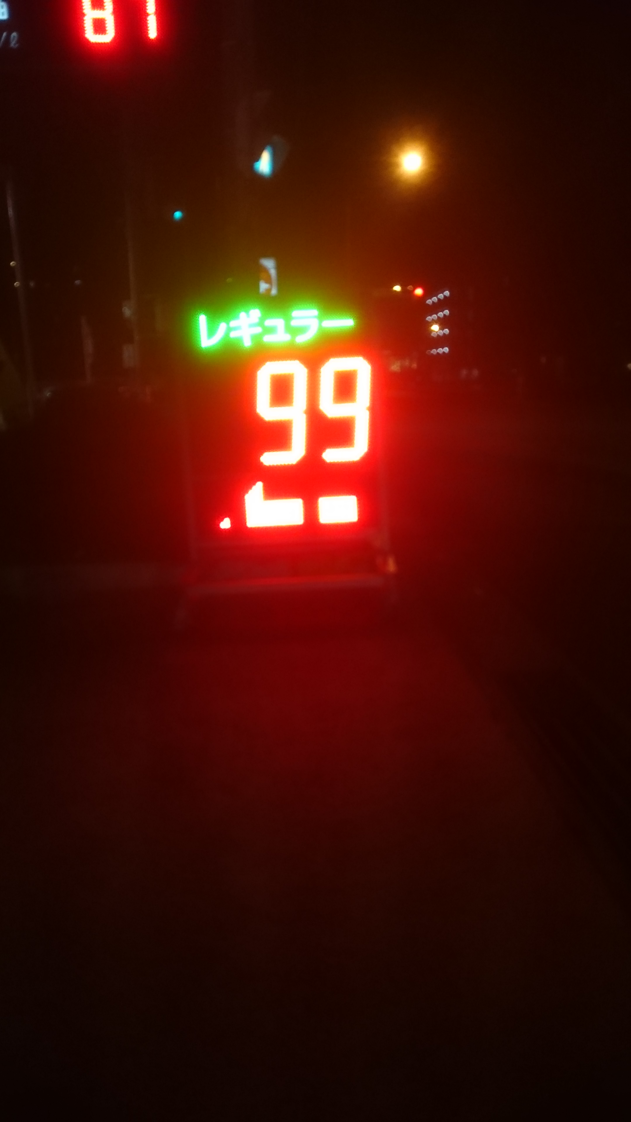 レギュラーガソリンの価格が、1リッターあたり100円を切って99円に!