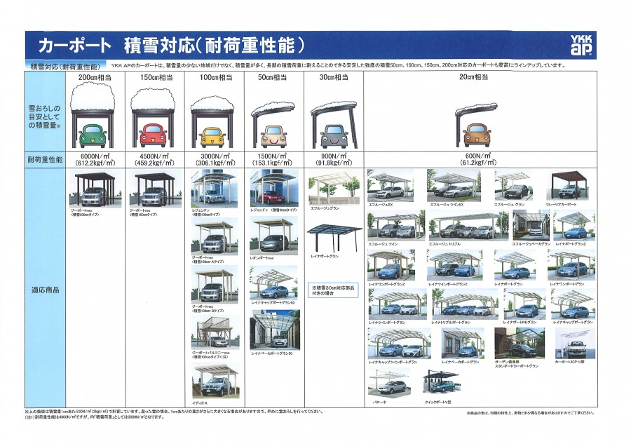 下記表を参考にしていただき、積雪量が多い場合でも対応出来るカーポートにすることをお勧め致します。