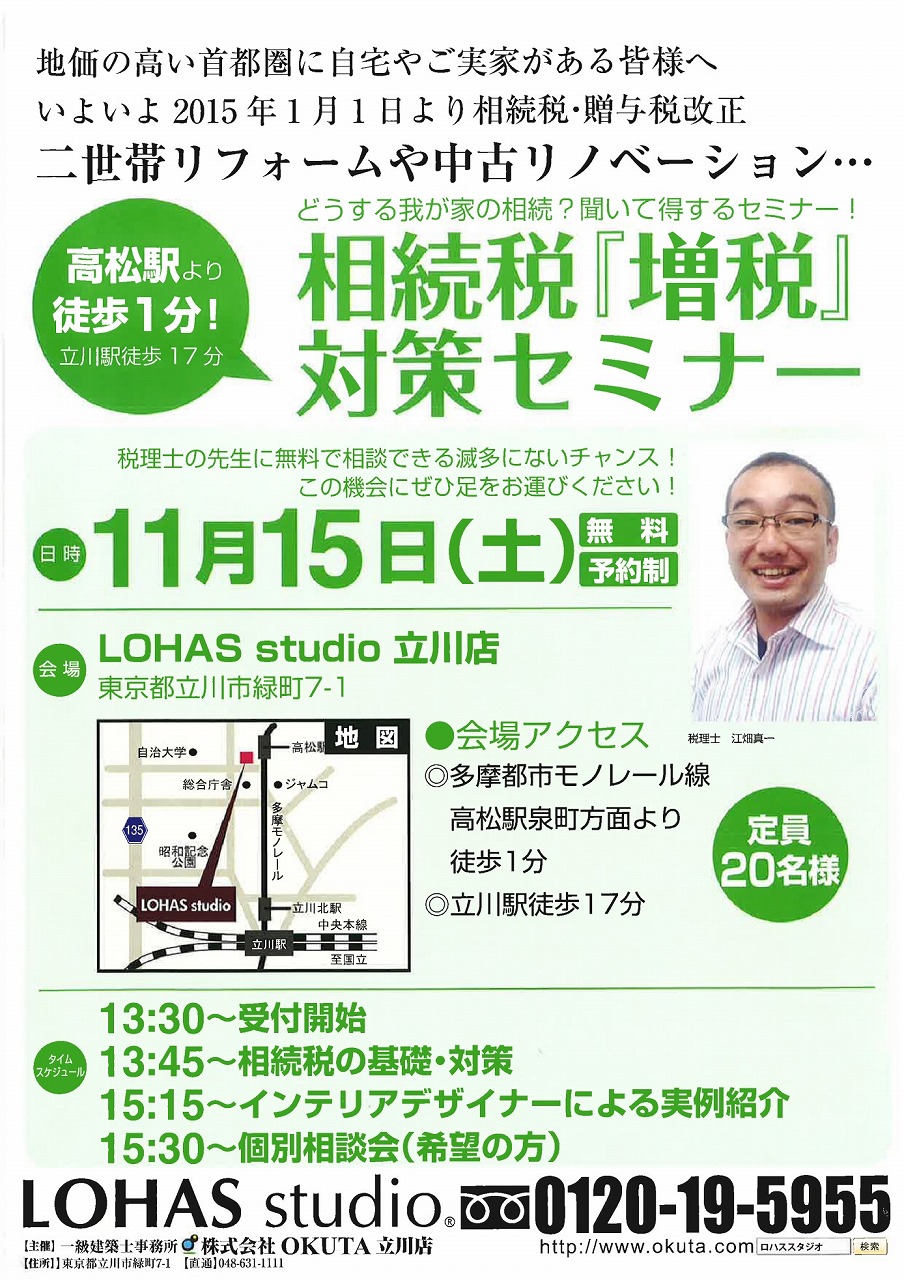 必ず役に立つ!相続税「増税」対策セミナー開催(株式会社OKUTA LOHAS studio所沢店のブログ 矢崎一@OKUTAのブログ) リフォームのオクタ