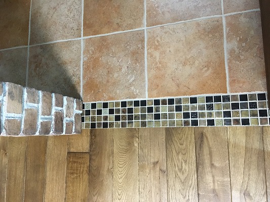 タイルとフローリングの見切り材にモザイクタイルを貼りました! アクセントになりとてもデザイン的にも素敵になりました!