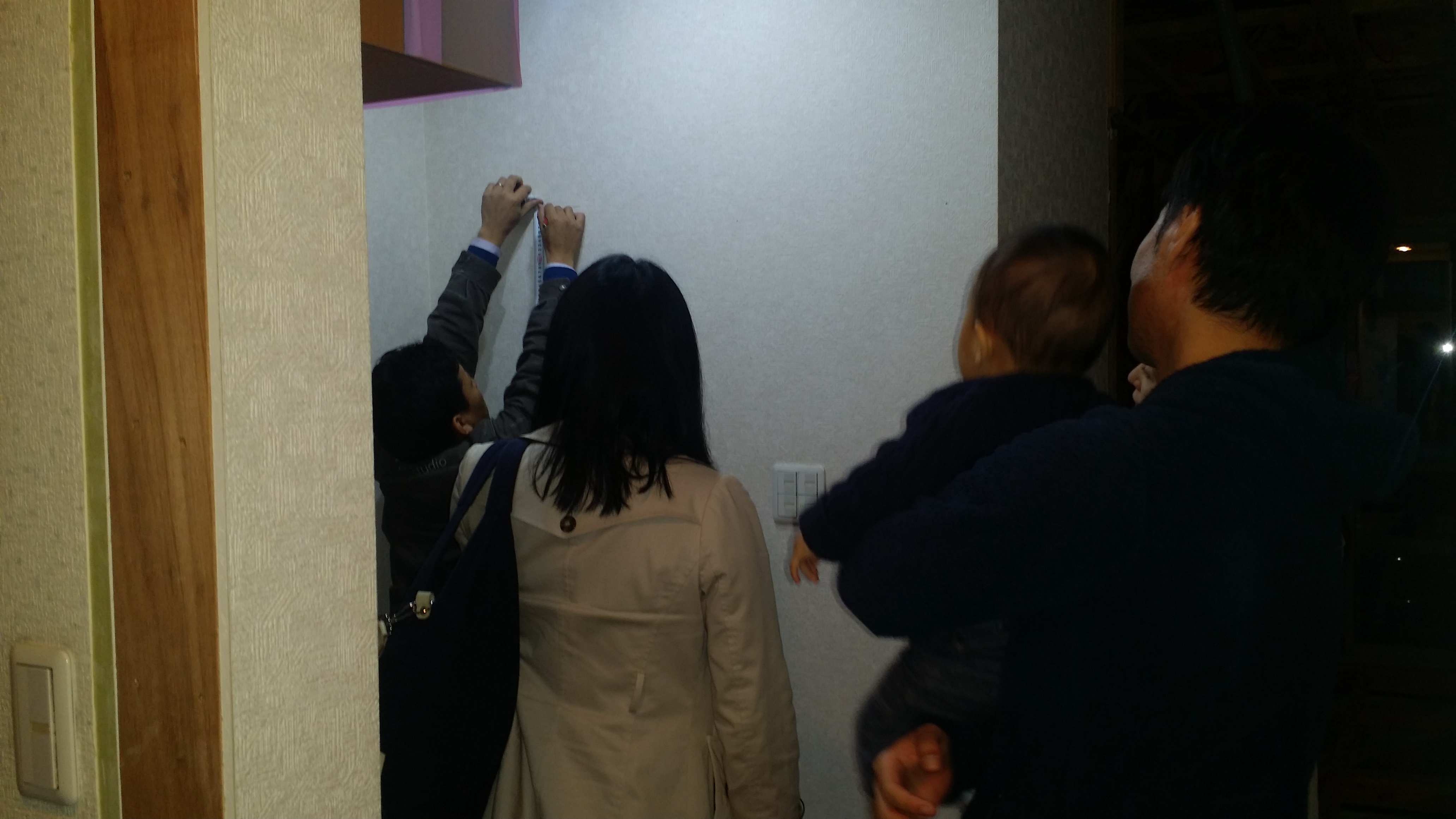 壁に取り付けたい物があり、ここでしょうかねと場所を決めているところです。