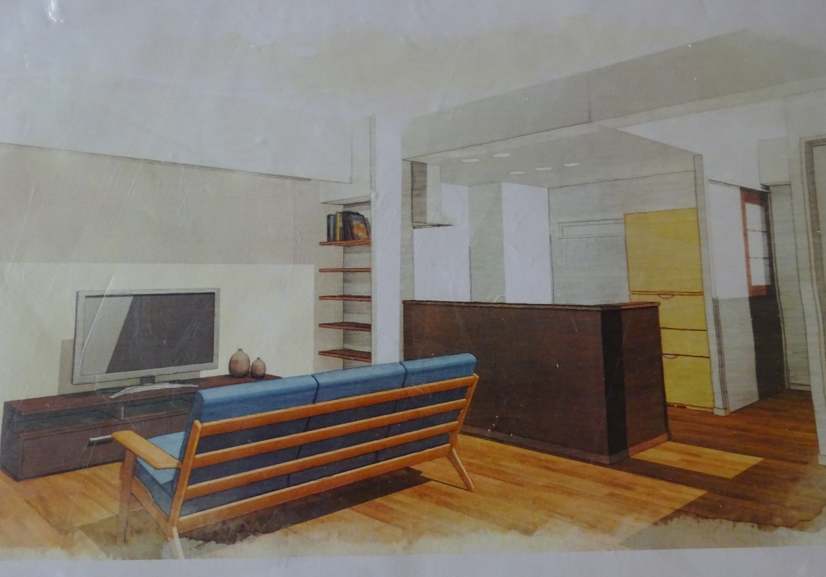 腰壁の向こう側にはシステムキッチンが設置される予定で、