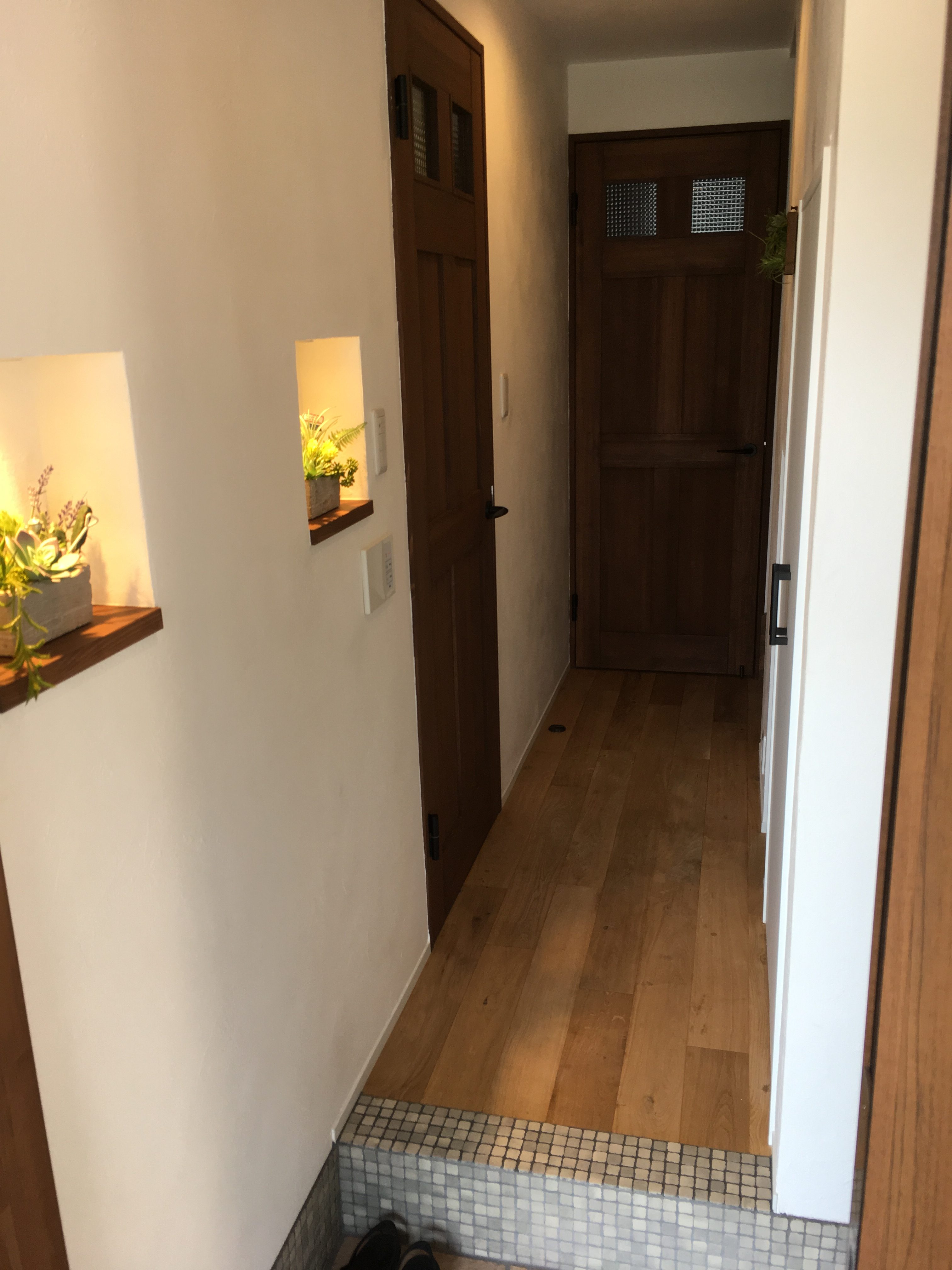 玄関タイルから、無垢の床、ニッチ造作、無垢ドアのナチュラルな雰囲気を玄関入ったところから、