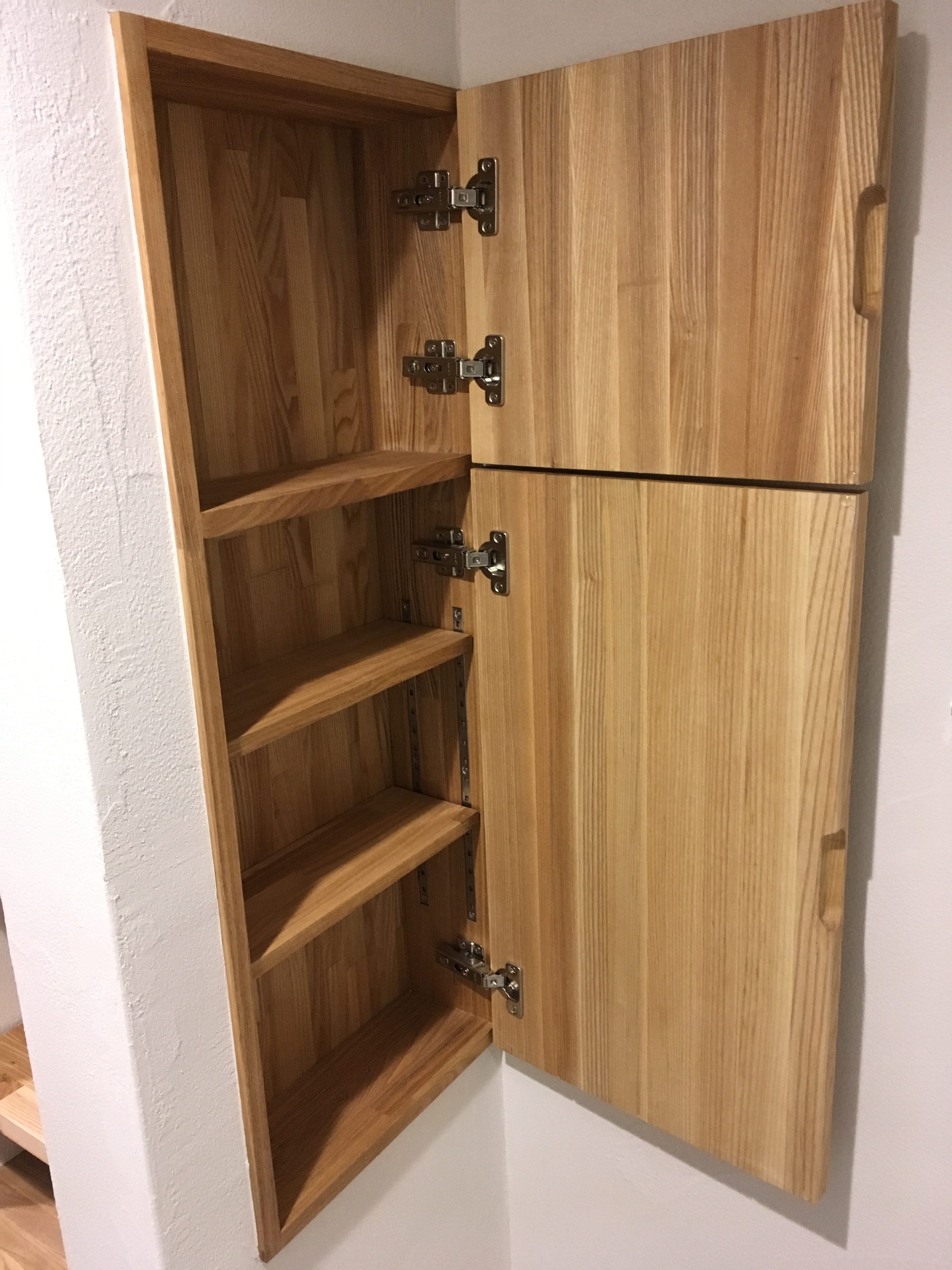 こんにちは。 本日は、壁面収納を紹介します。 自社製品のもので、素材は無垢のアッシュです! 既製品だと、とってつけた感があると悩まれる方も多いはず、、 ぜひ参考にしてください。
