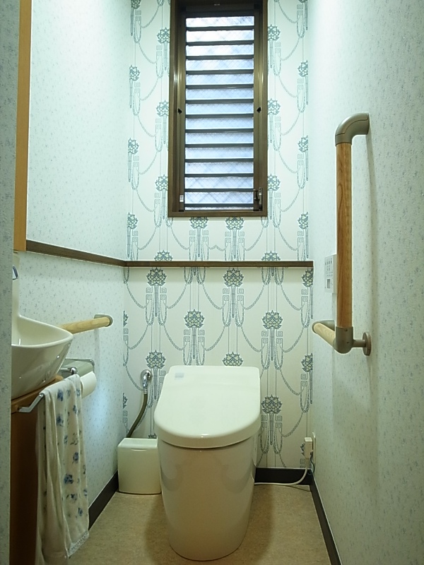 北欧のクロスをお選びになったお客様のトイレをもう一つ。 こちらは1Fのトイレ。 こちらは爽やかなブルーを基調に。 正面をアクセントに。