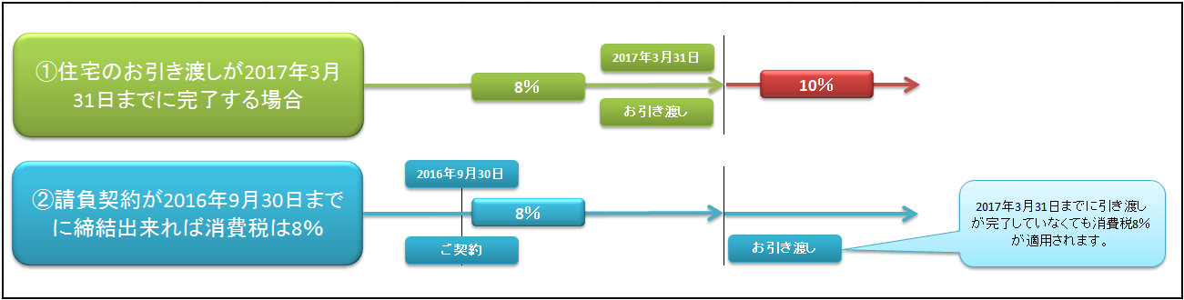 2、但し、増税開始日の6ヶ月前である2016年9月30日までに、請負契約が締結されている場合は、お引き渡しが2017年3月31日を経過しても、経過措置として消費税8%が適用されます。