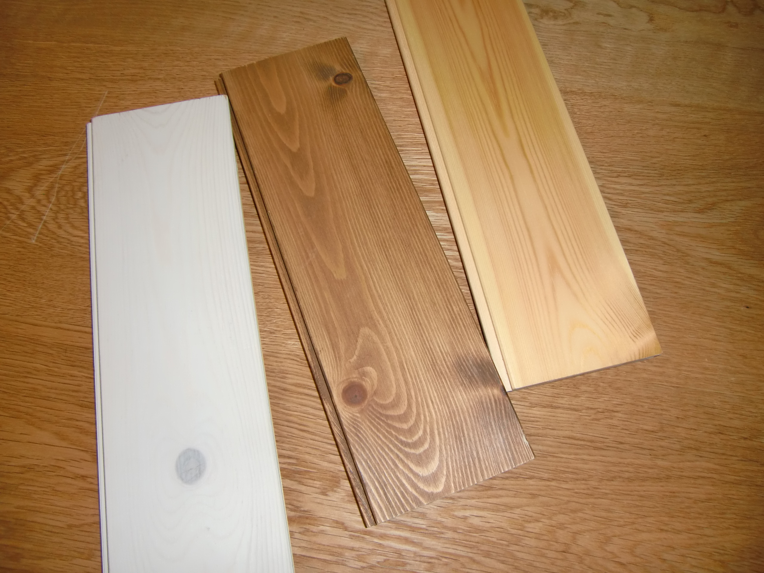 パイン床材。右は無塗装品。他は自然塗料による着色。