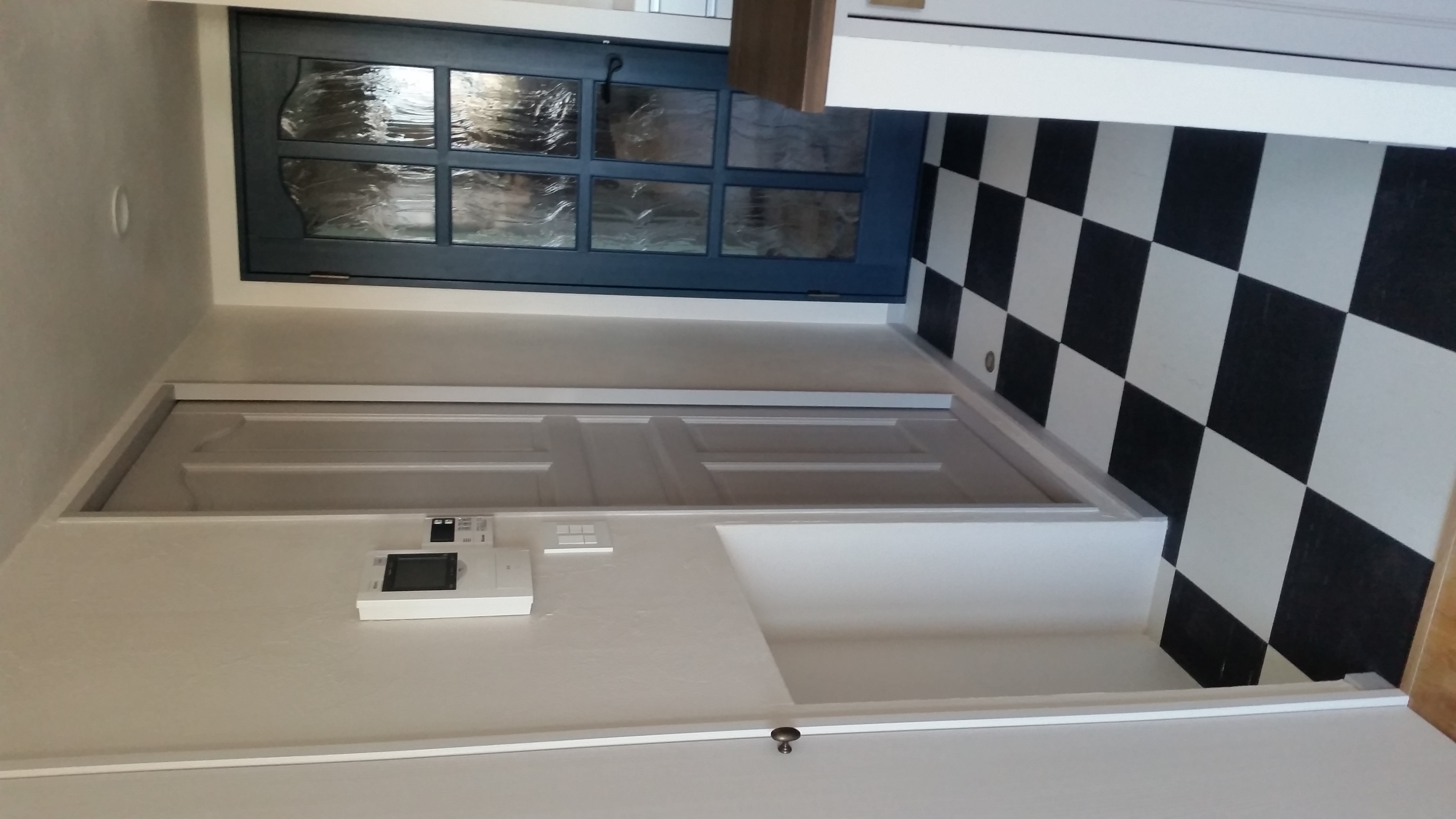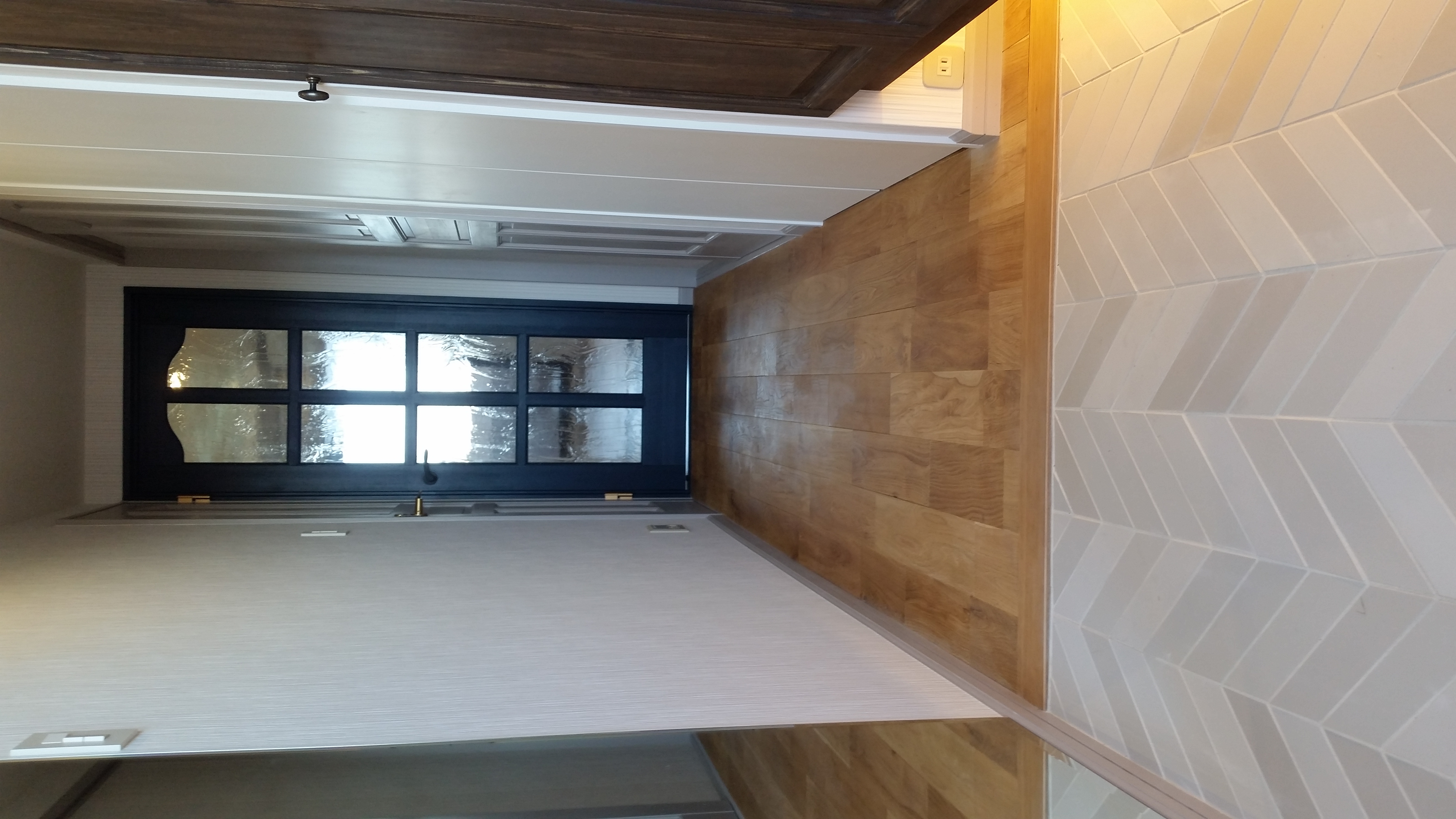 玄関にはヘリンボーンのタイル リビングドアには、ガラスランドガラスをはめ込み、印象的に仕上げました。 床には無垢のオーク材など、拘りポイント満載です。