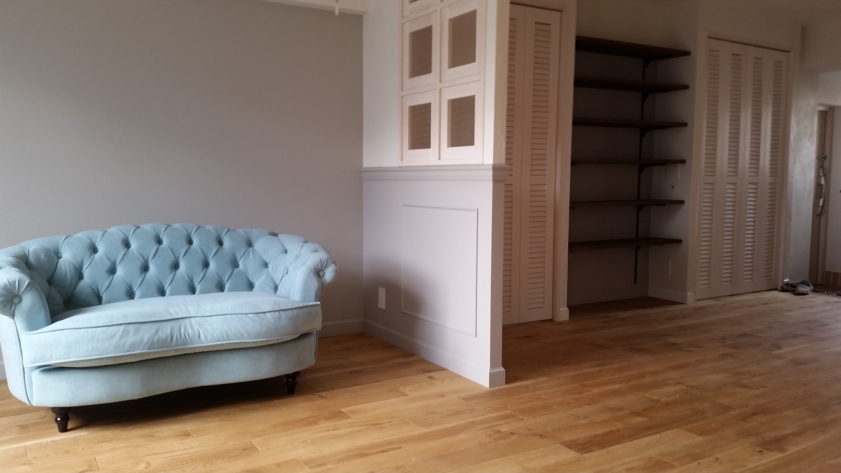 今回採用は、ウッドワンルーバー建具、サンタモールディング、ナラアンティーク無垢材、F&B塗装。