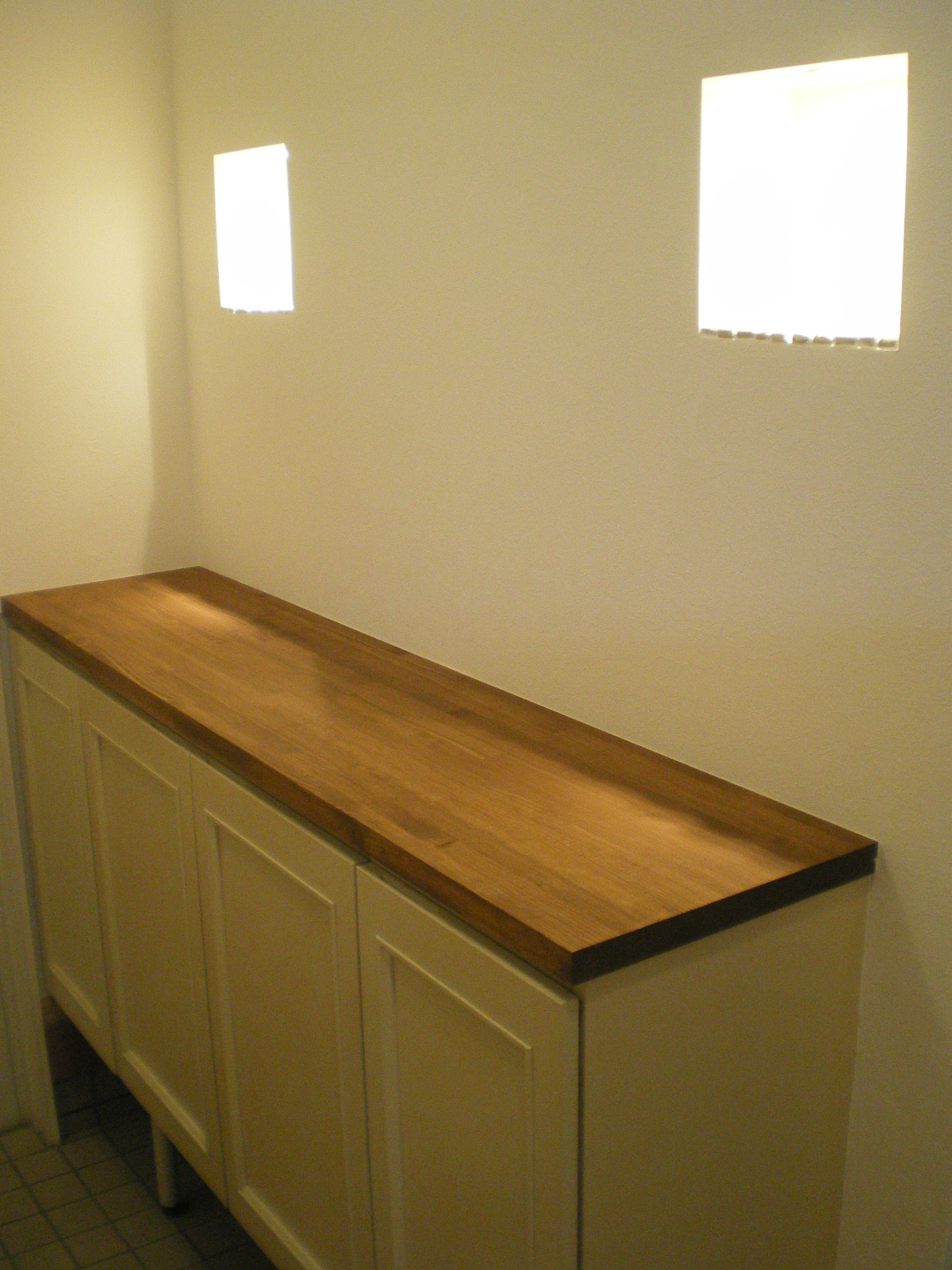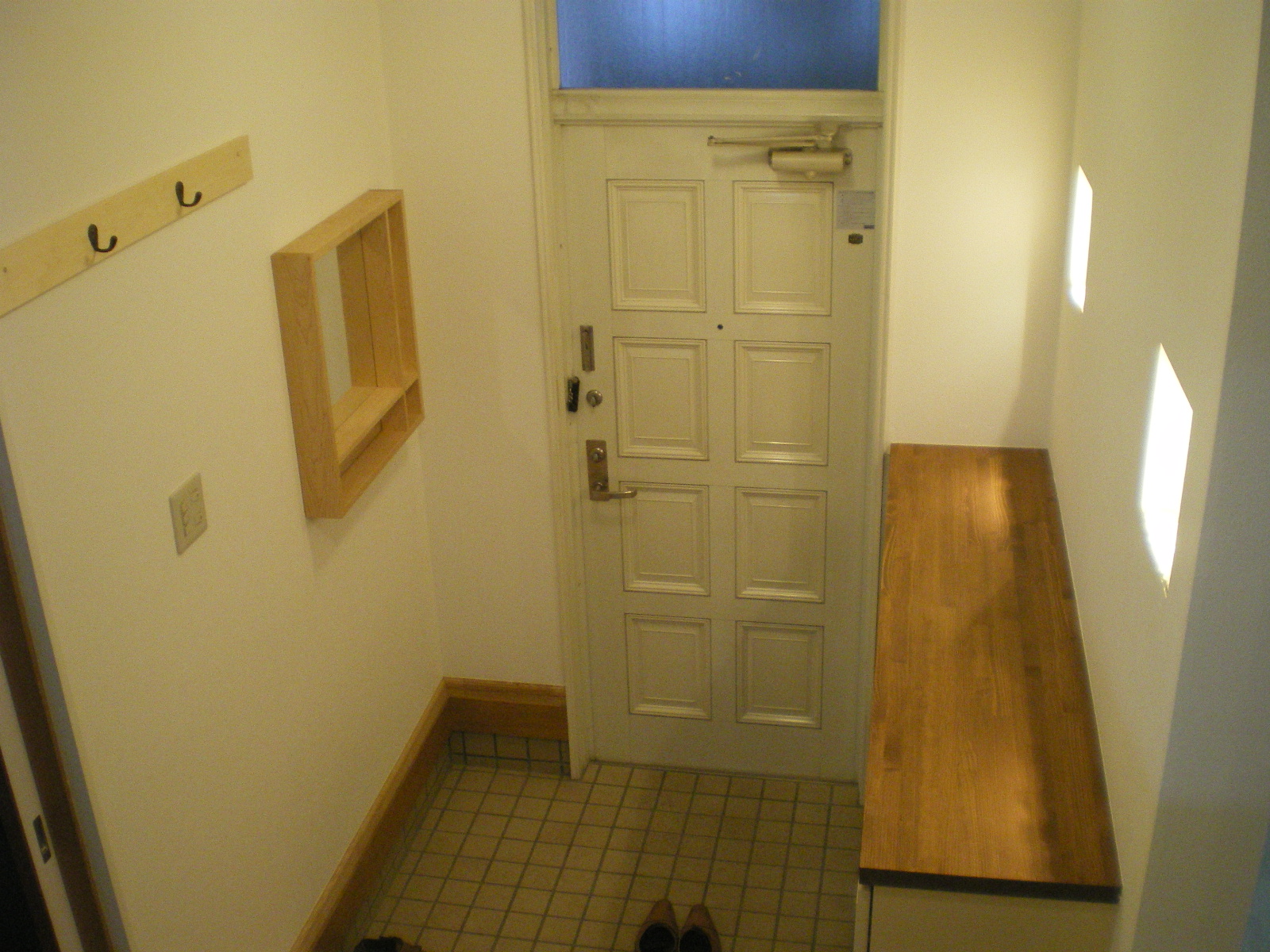 既存の玄関収納の天板を無垢のカウンターへ交換させて頂いたり、